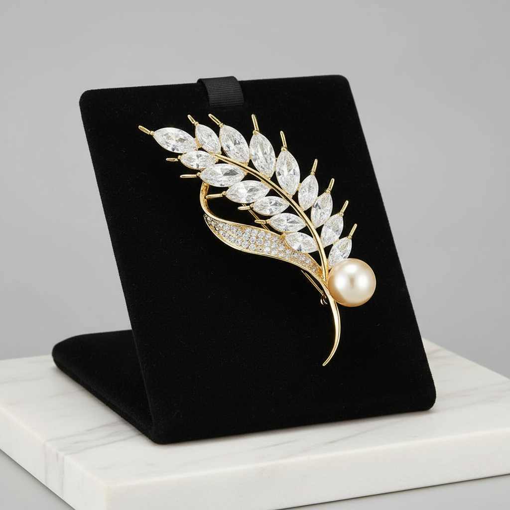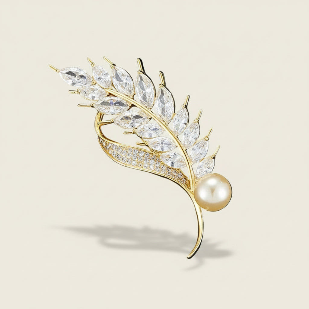 This graceful brooch showcases a gold-toned feather design adorned with marquise-cut and pavé-set gemstones, finished with a dangling pearl. Elegant and refined, it blends sparkle and softness for a timeless accessory.