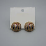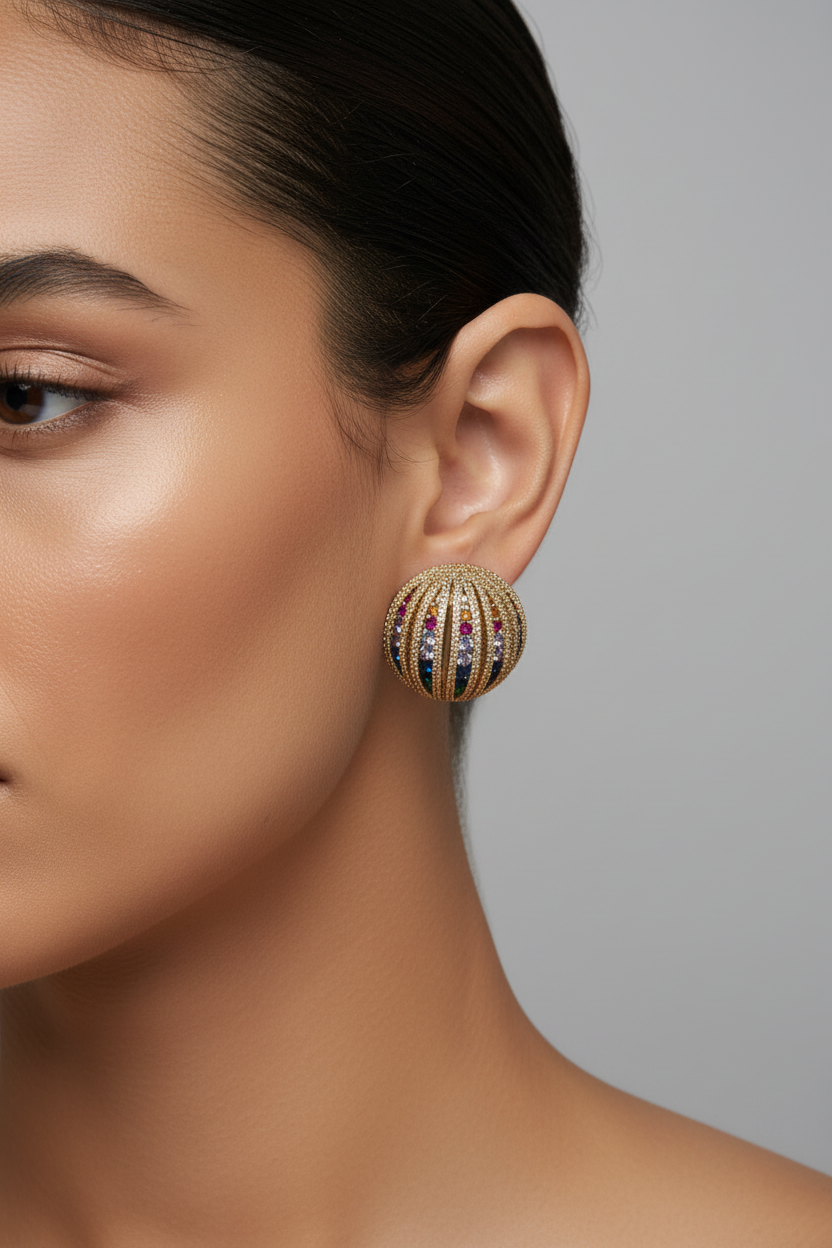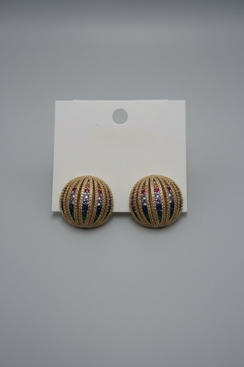 Bold gold-toned dome stud earrings featuring vertical ridges adorned with multicolored crystal pavé stripes in a statement-making design.