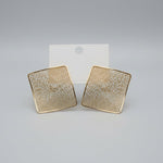 Bold gold-toned square stud earrings featuring an intricate filigree lace pattern with textured metalwork for a statement finish.