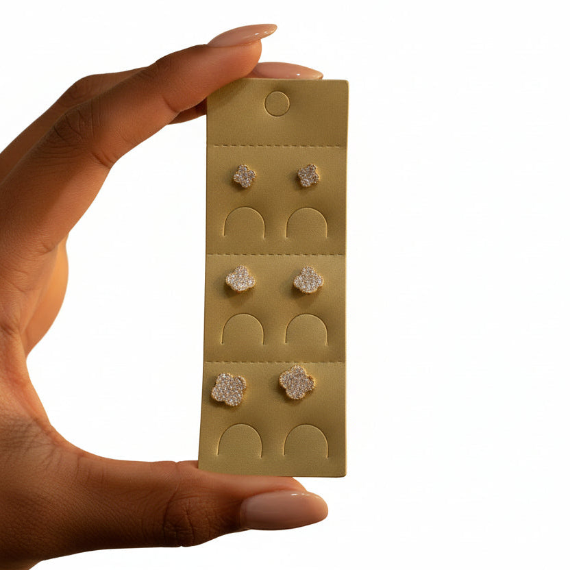 Sophisticated three-pair stud earring set in gold tone featuring quatrefoil-shaped pavé crystal designs in graduated sizes for timeless elegance.