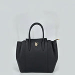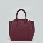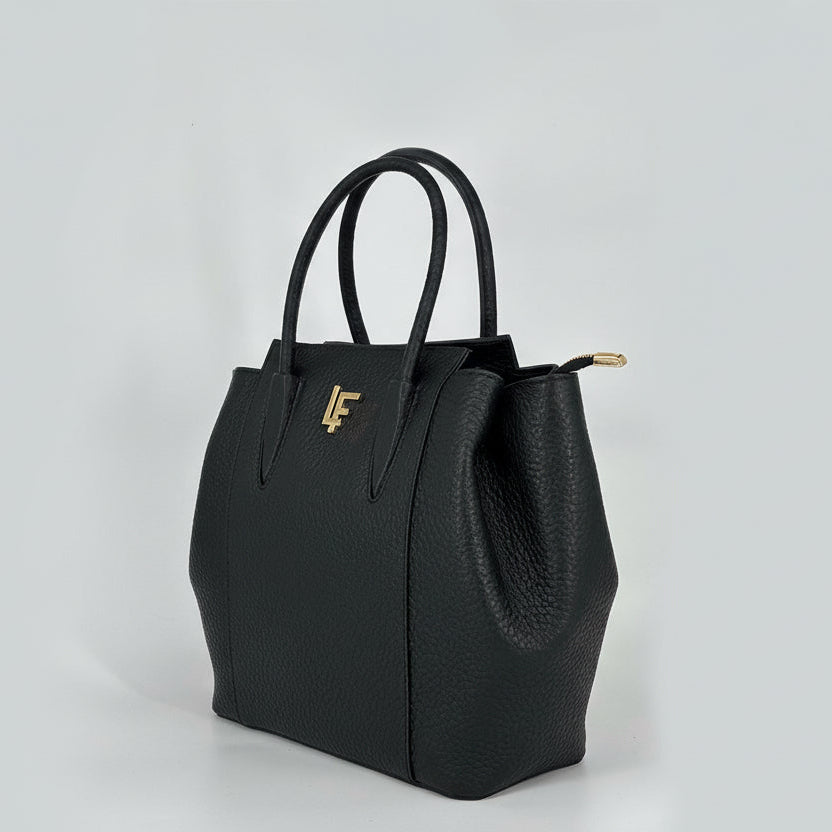 Premium sophisticated pebbled 100% leather luana ferracuti tote bags with rolled top handles, available in black and deep burgundy.