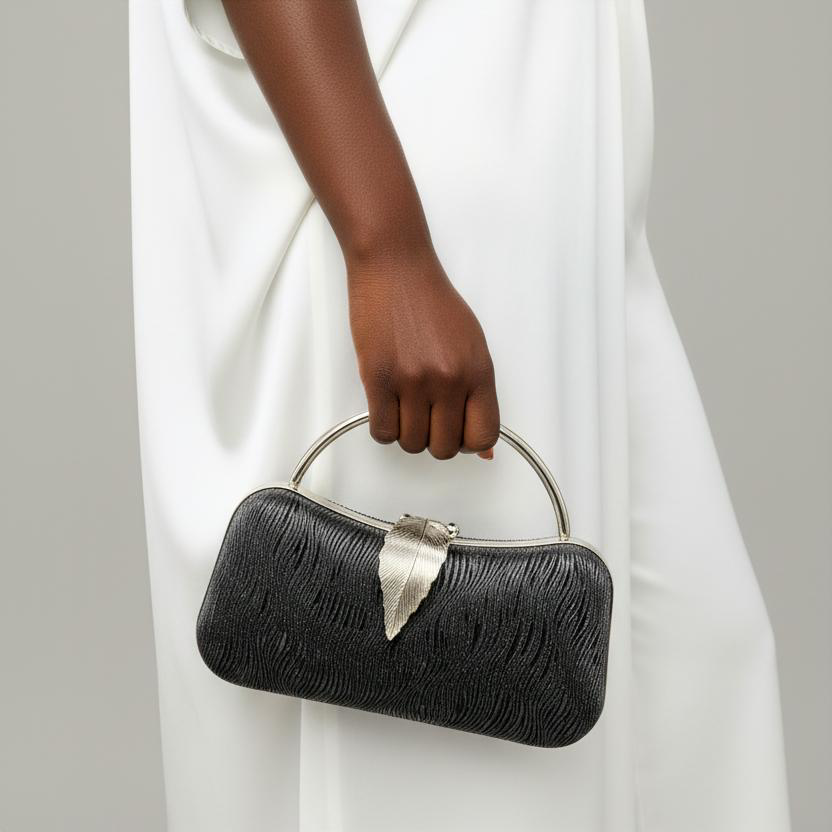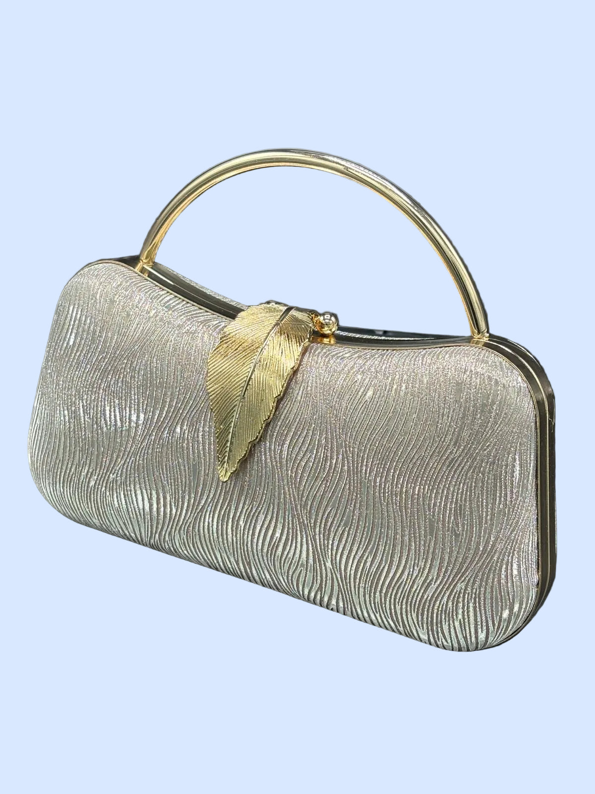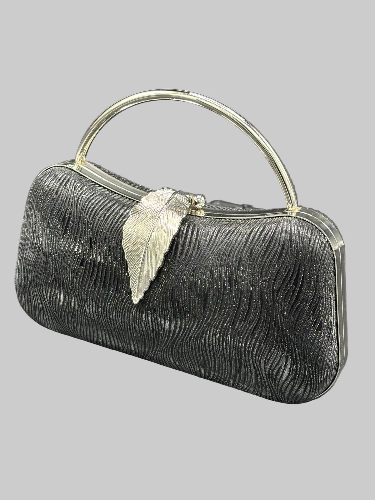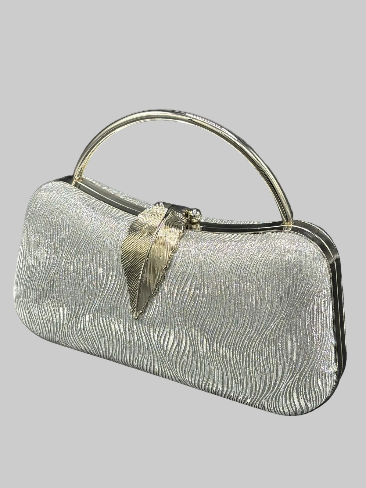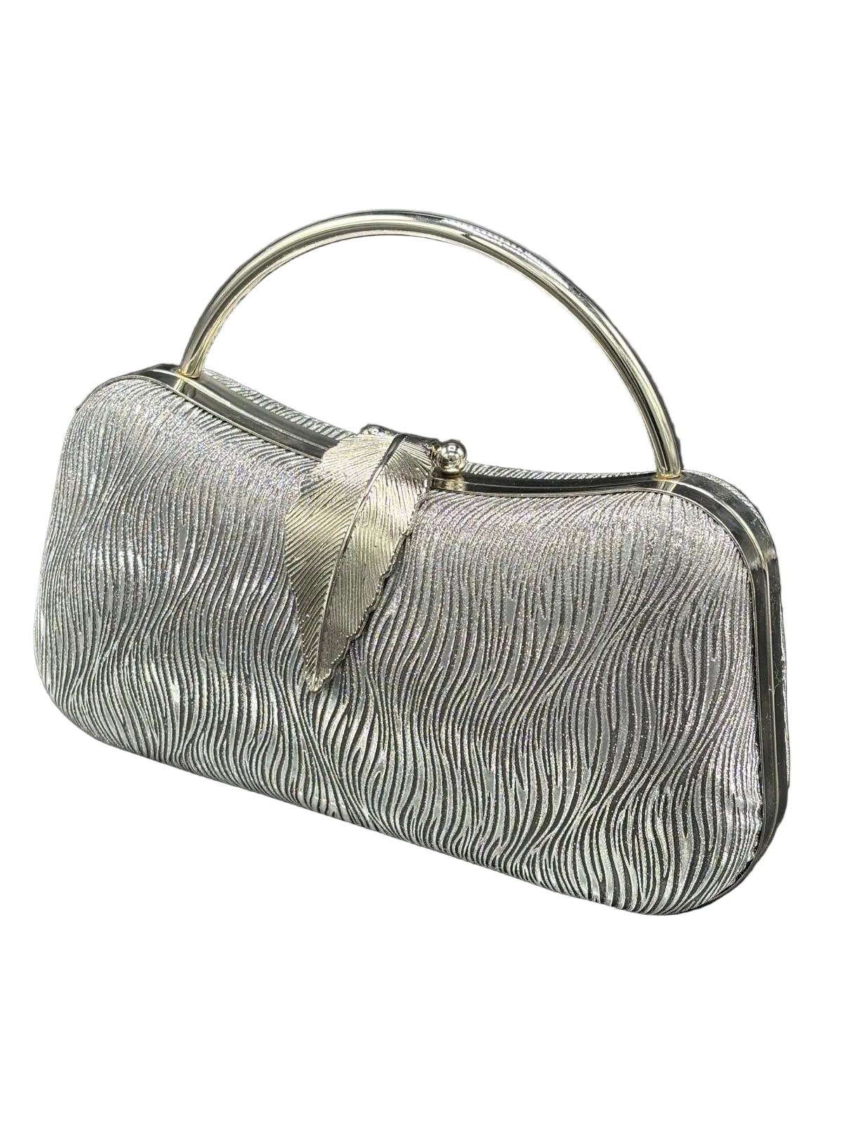Glamorous wave-textured evening clutch featuring a sculptural metallic ring handle, ornate leaf clasp closure, and shimmering ripple fabric, available in platinum, gold, and silver.