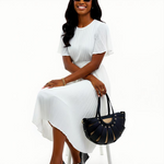 Statement half-moon bag featuring sculptural radiating faux leather panels with woven raffia insets, gold-toned stud accents, and removable crossbody strap.