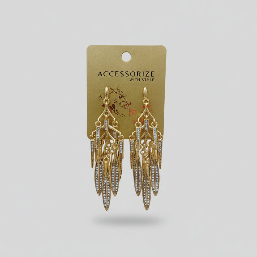 Dramatic gold-toned drop earrings featuring cascading leaf-shaped elements with pavé crystal detailing in a nature-inspired design.