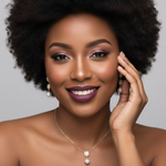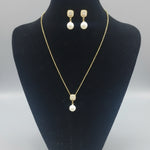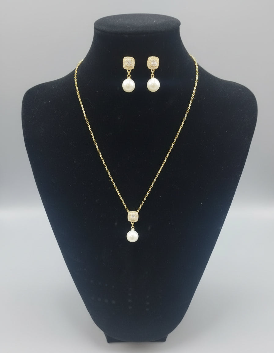 A delicate chain necklace with a crystal-pavé square pendant and dangling pearl drop, paired with matching drop earrings.