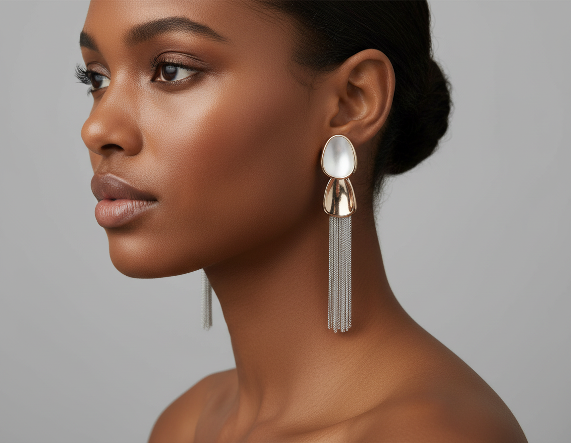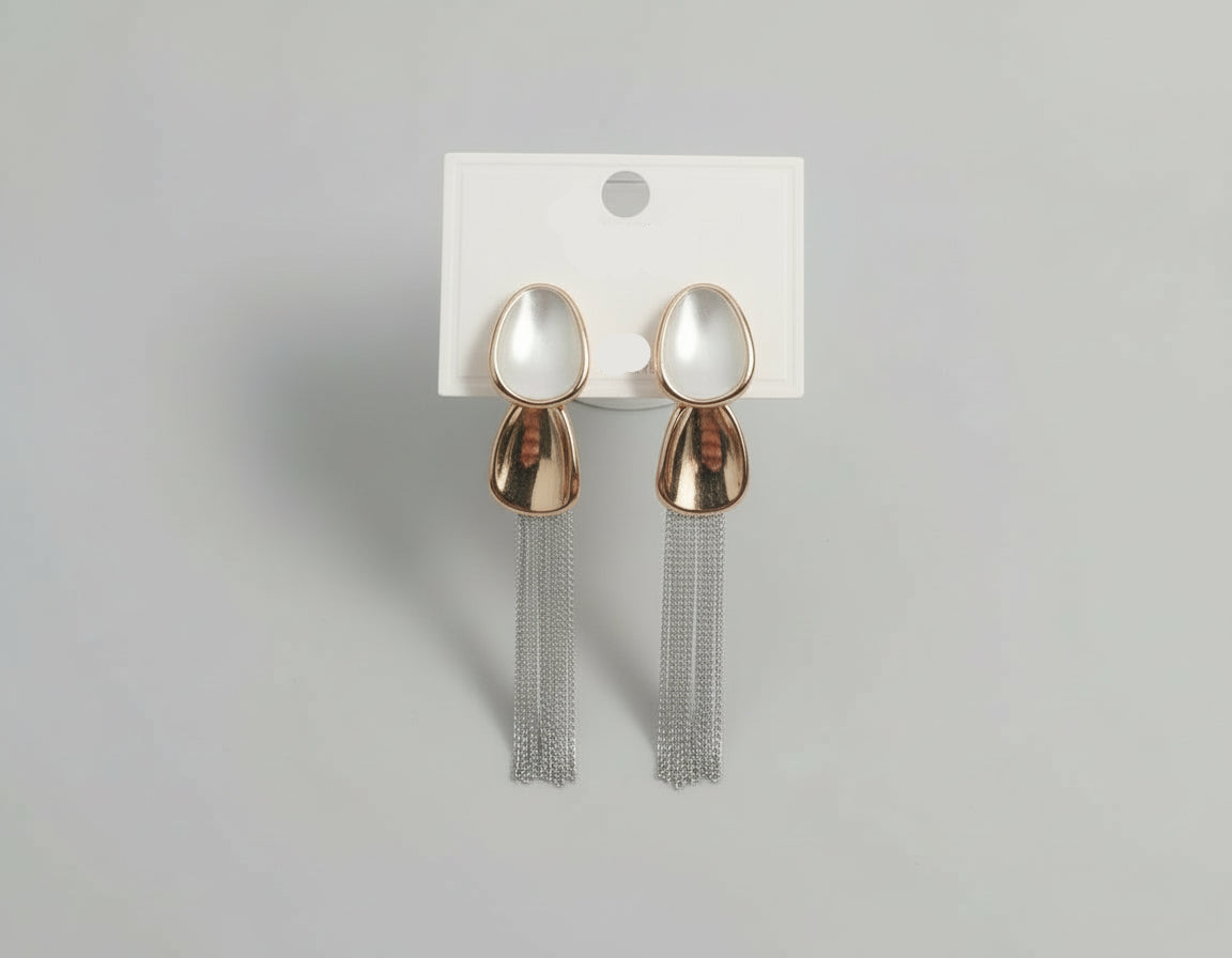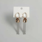 Rose gold-tone drop earrings featuring pear-shaped cat's eye stone tops with polished geometric accents and long dangling chain tassels.