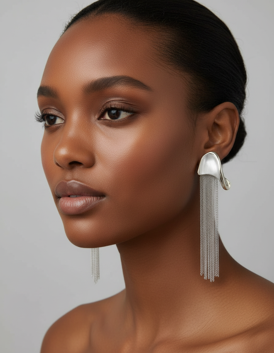 Sterling silver drop earrings with brushed crescent tops and long, shimmering crystal mesh tassels.