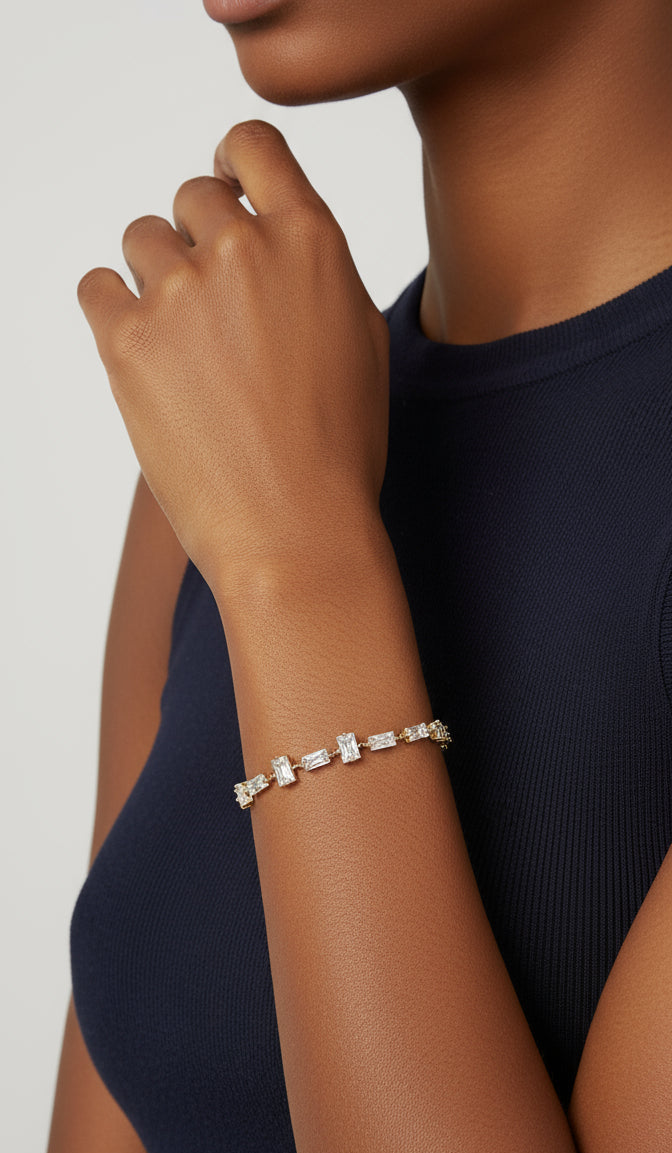 This gold-tone bracelet features clear baguette-cut cubic zirconia arranged at subtle angles for a modern, refined look.