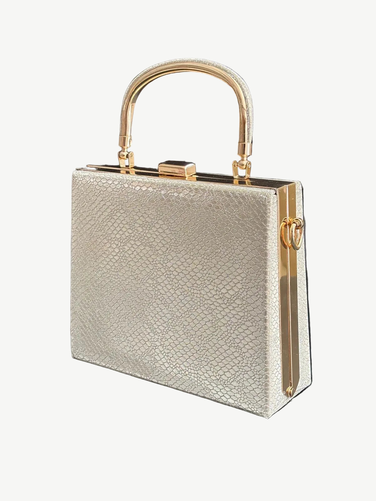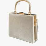 Sleek metallic snake-embossed box clutch featuring a structured square silhouette, gold-toned rigid top handle, push-clasp closure, and mirror-finish frame edges in champagne gold.