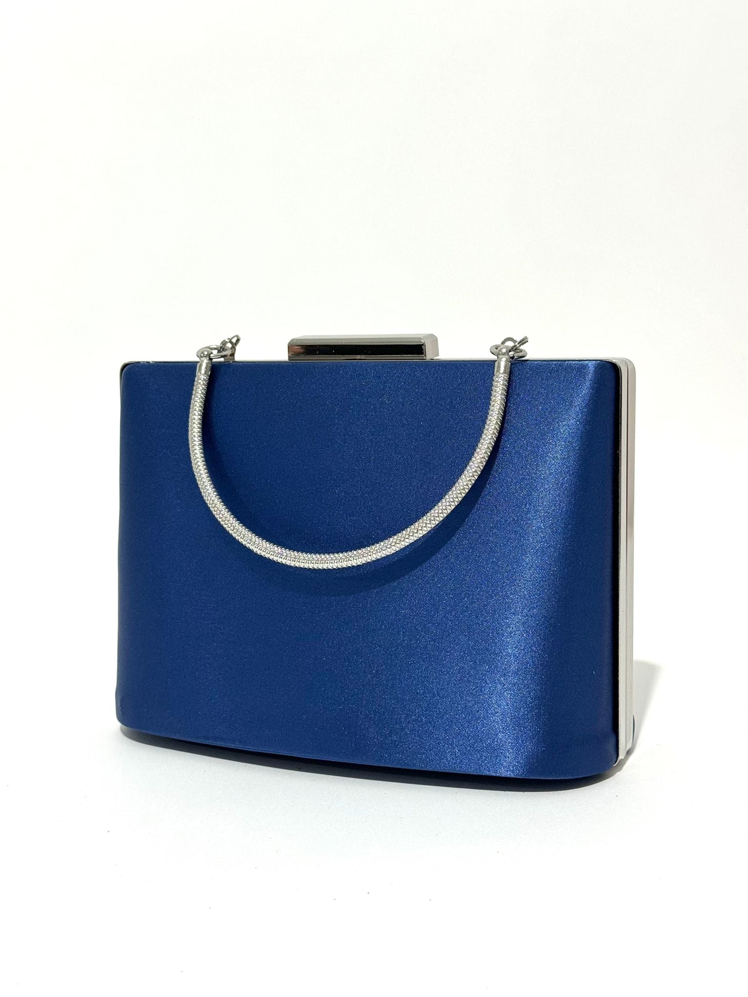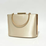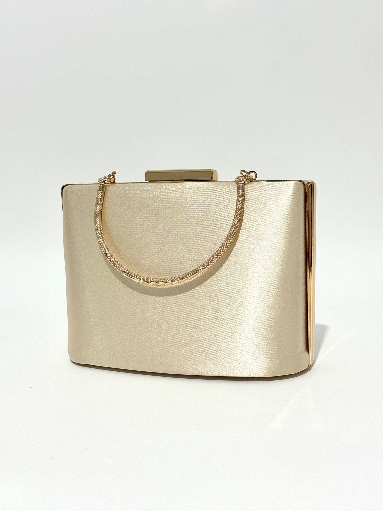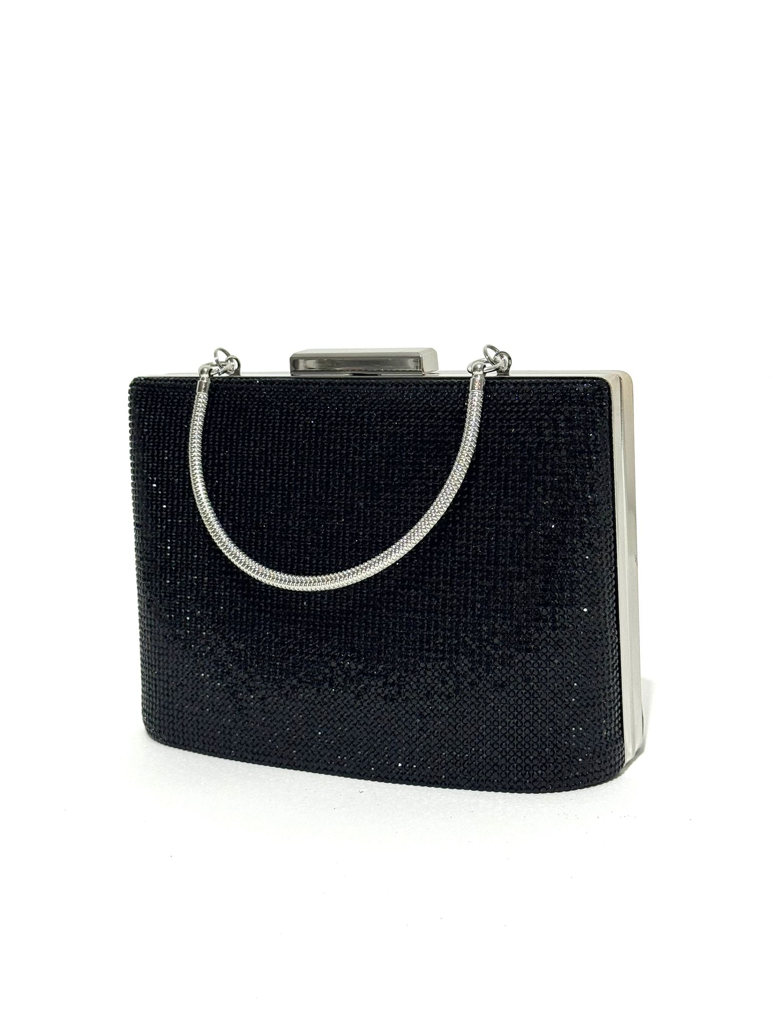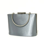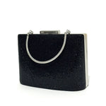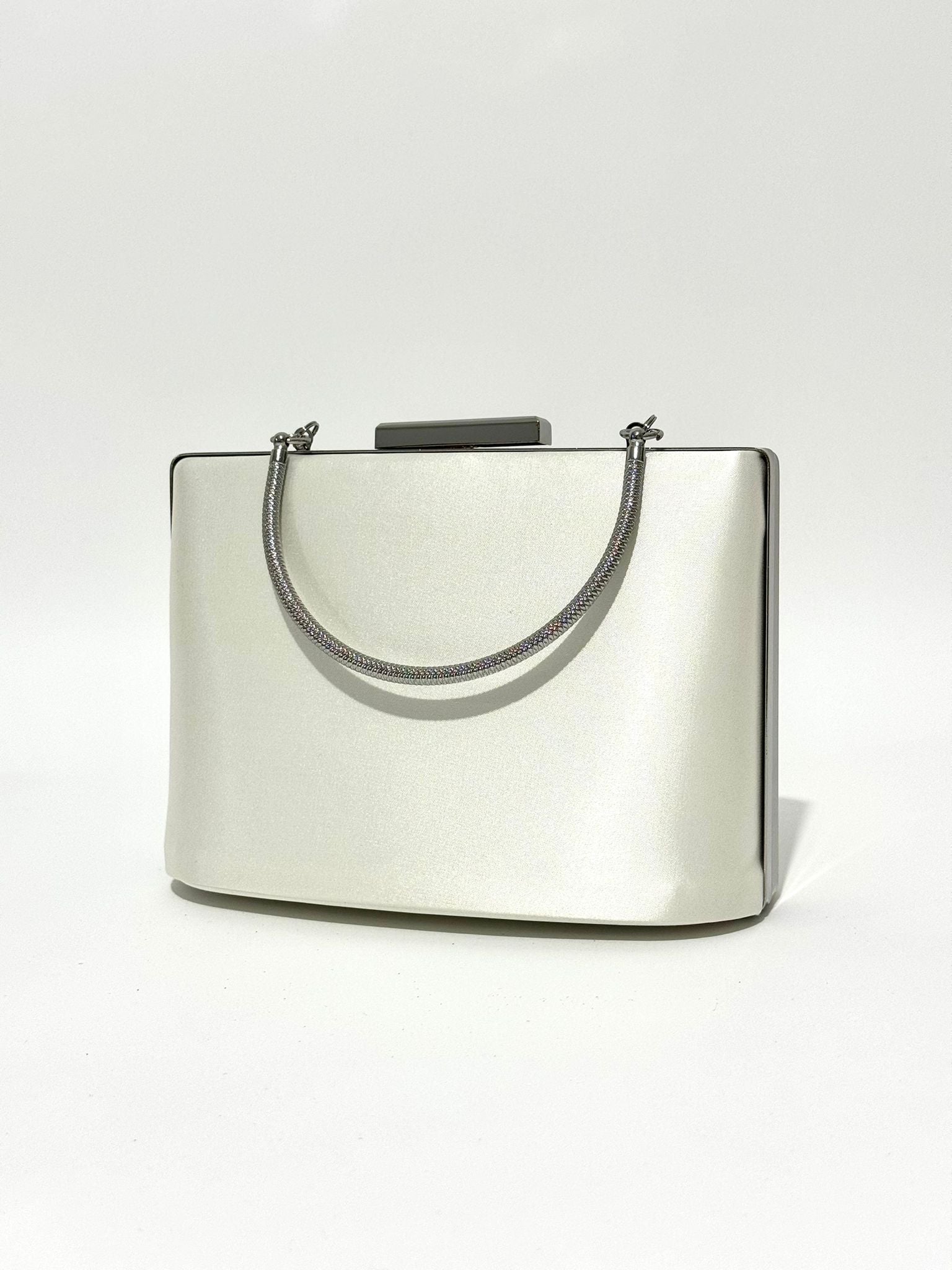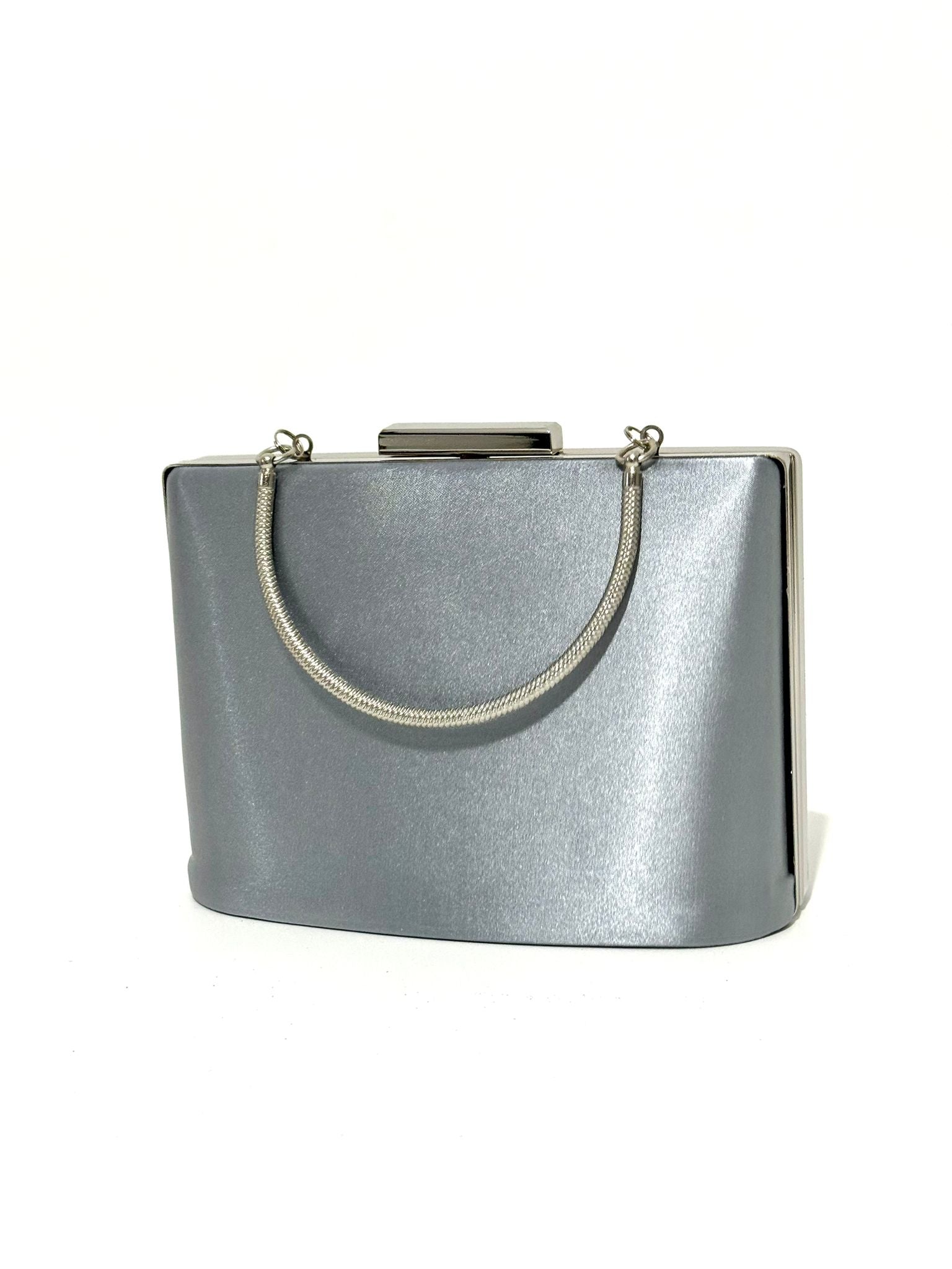 Sophisticated structured box clutch featuring a smooth satin-finish body, twisted rope chain top handle, push-clasp closure, and mirror-finish frame edges, available in gunmetal grey, pearl silver, jet black glitter, and champagne gold.