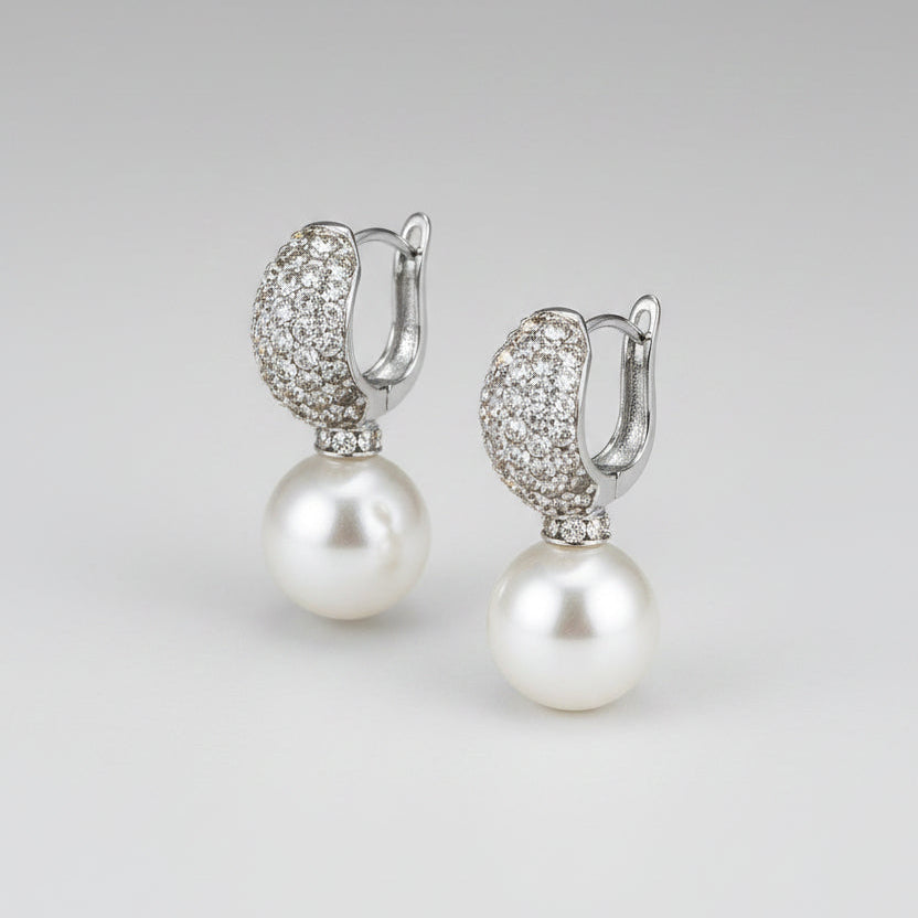 Sophisticated double-pearl drop earrings featuring lustrous freshwater pearls suspended from a crystal-pavé gold-toned huggie hoop for effortless day-to-evening elegance.