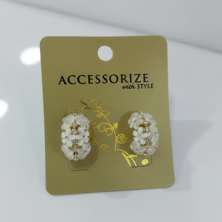Gold-tone stud earrings featuring clusters of delicate white enamel flowers with sparkling crystal centers.