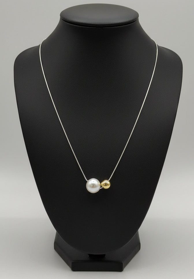 Silver-tone necklace featuring a delicate snake chain with two-tone (silver and gold) sliding sphere pendant accents.