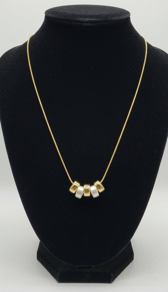 Gold tone snake chain necklace featuring three faceted crystal pendants in a triangular arrangement: smoky gray, deep black, and smoky gray.