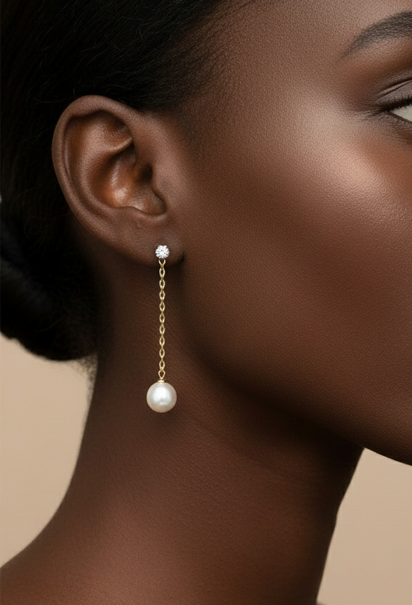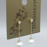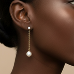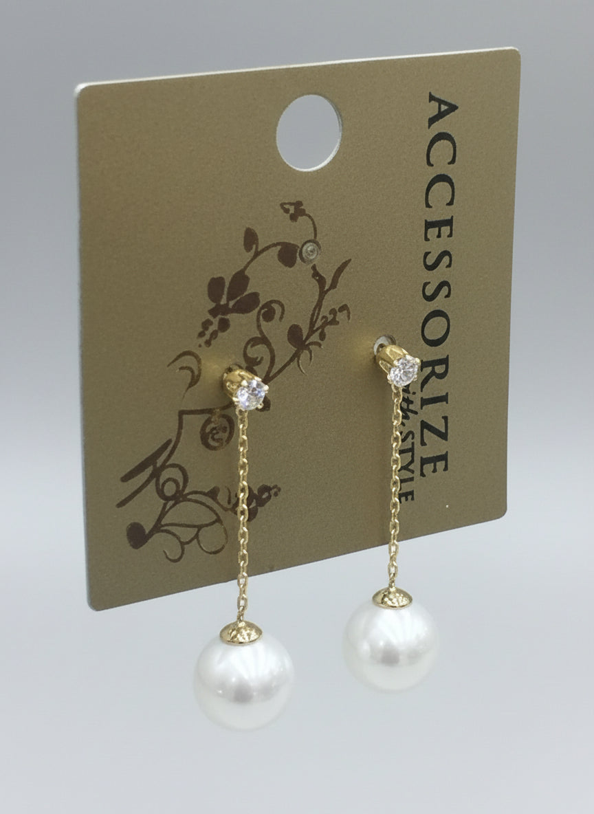 Delicate drop earrings featuring a gold-tone chain with a white pearl accent and a small cubic zirconia stud.