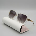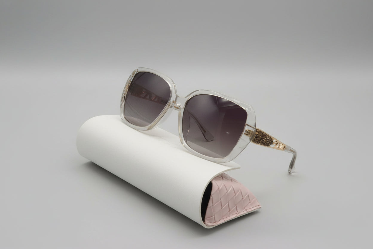 Glamorous Barcur sunglasses featuring a clear crystal acetate frame, gradient smoke lenses, and gold-toned crystal-encrusted temples, complete with a white quilted faux leather case.