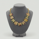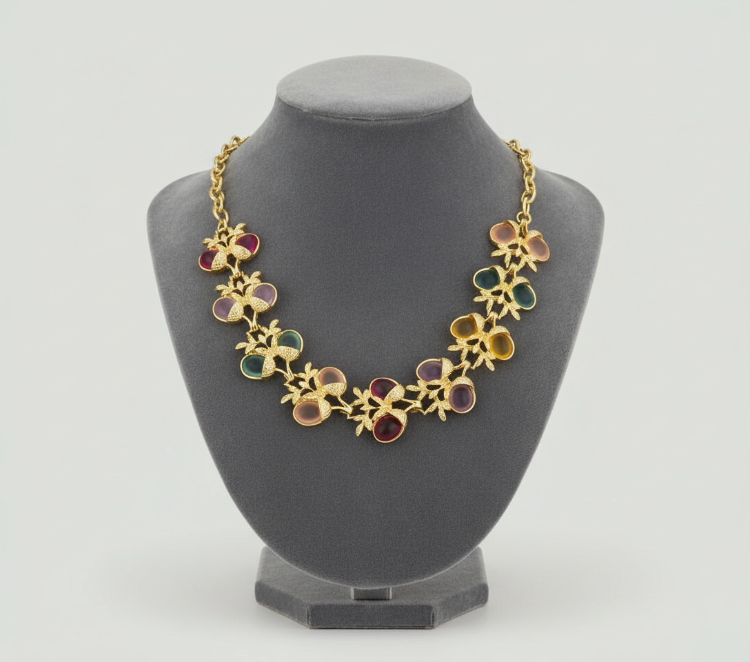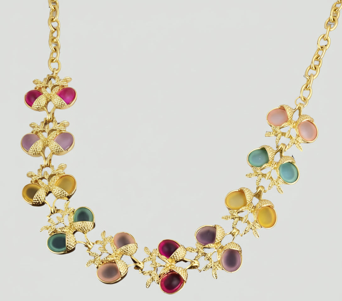 This gold-toned bib necklace features clusters of pastel cabochon gemstones framed by leaf-inspired metalwork. Its intricate design and soft colors create an elegant, nature-inspired statement piece.