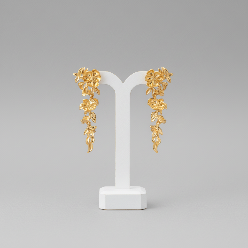 These gold drop earrings feature cascading floral and leaf motifs, sculpted to resemble a blooming vine. Their intricate design brings a touch of natural elegance to both formal and everyday looks.