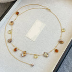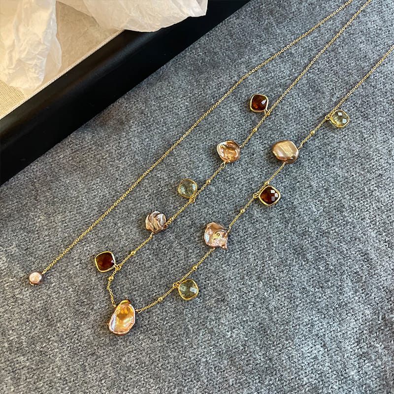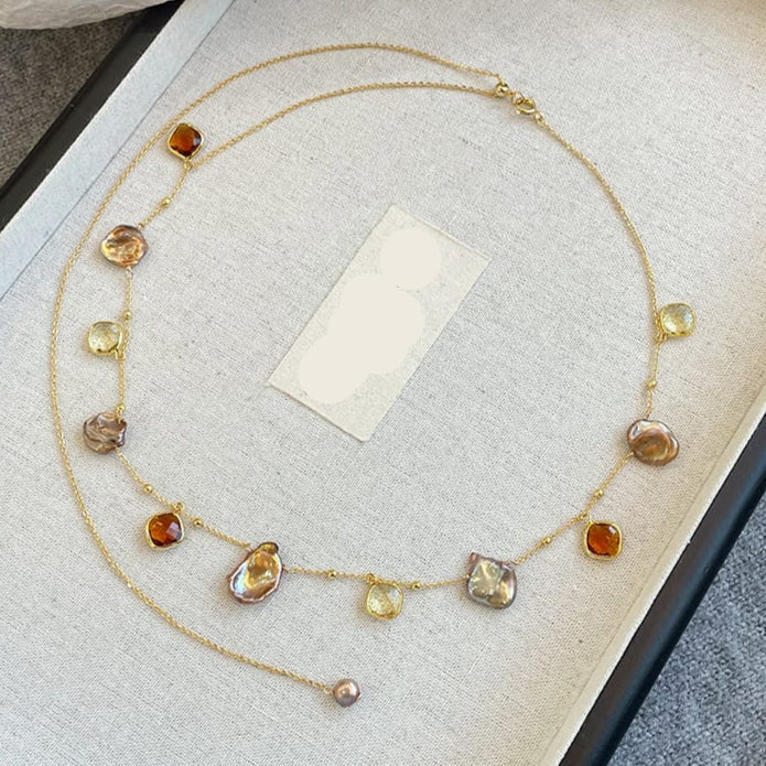 This elegant statement necklace features a delicate, irregularly shaped assortment of baroque pearls, amber-colored stones, and crystal beads. The muted, earthy tones provide a sophisticated touch. The small, spaced beads are strung on a thin gold chain, adding a touch of refinement to any outfit.