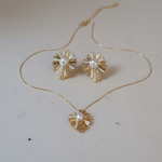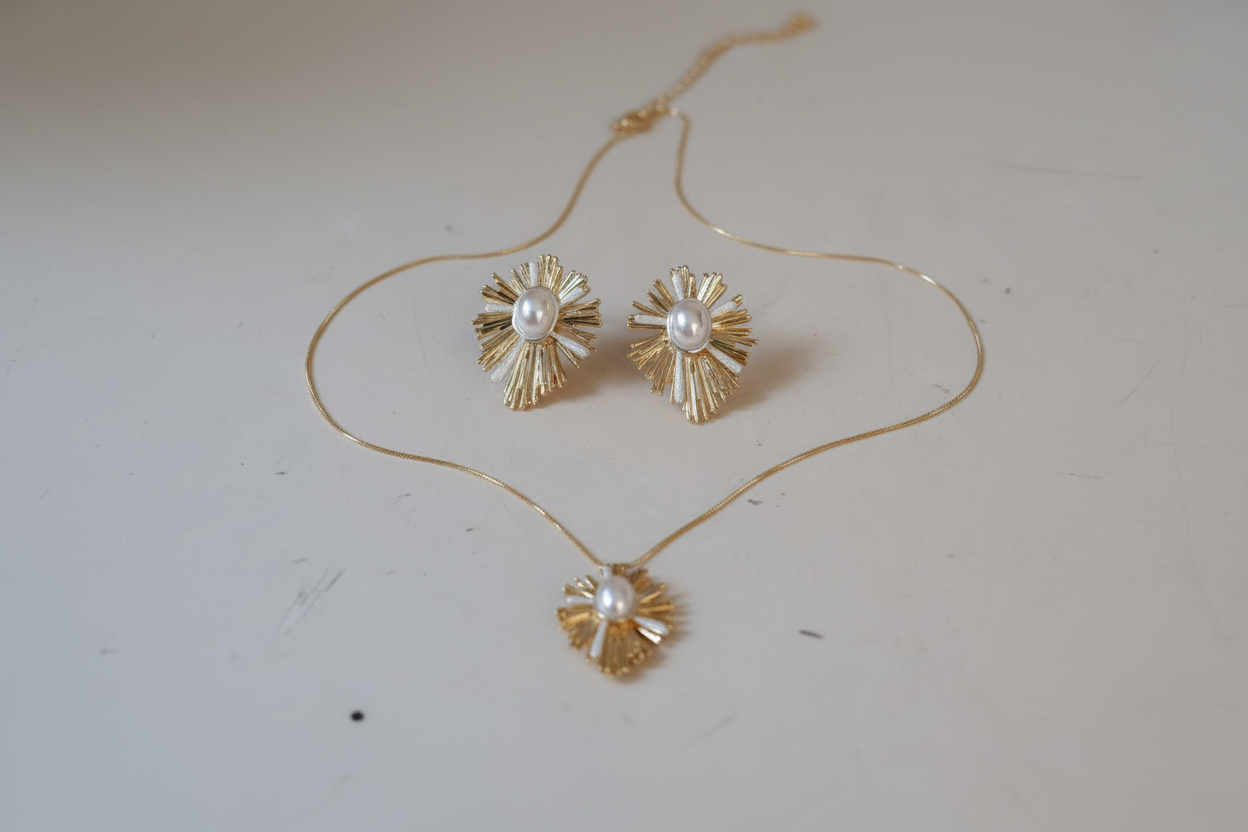 Elegant gold-toned jewelry set featuring a delicate chain necklace with textured sunburst pendant cradling a lustrous pearl and matching sunburst stud earrings.
