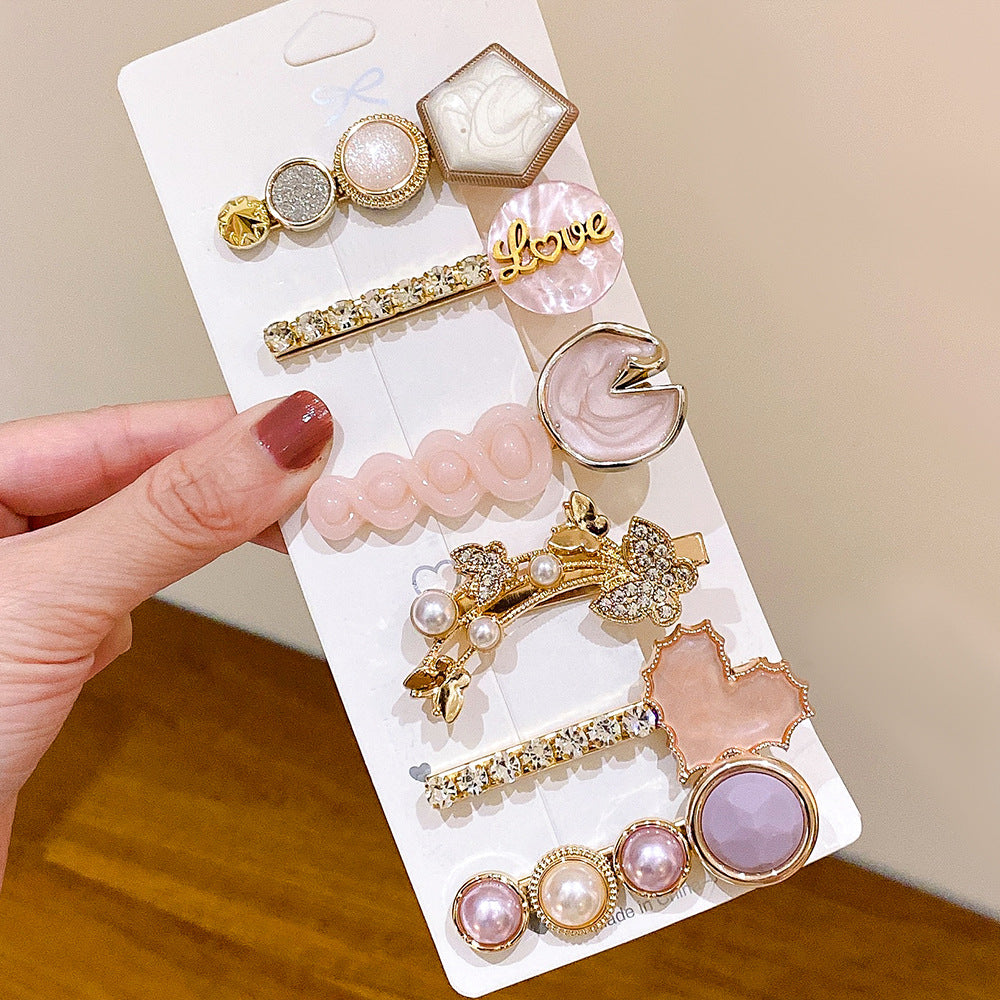 This set of hair clips is designed with handmade pearls and features a fashion-forward style that incorporates geometric shapes and flower designs. They are perfect for women who want to accessorize their hair with sweet and stylish barrettes, and are suitable for girls as well.