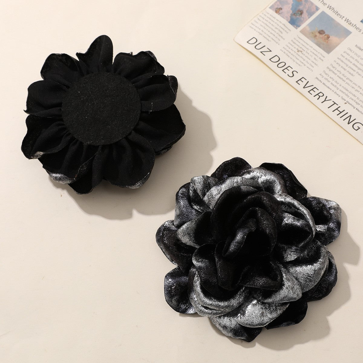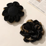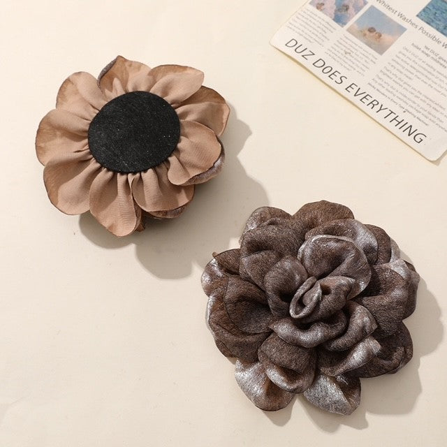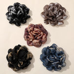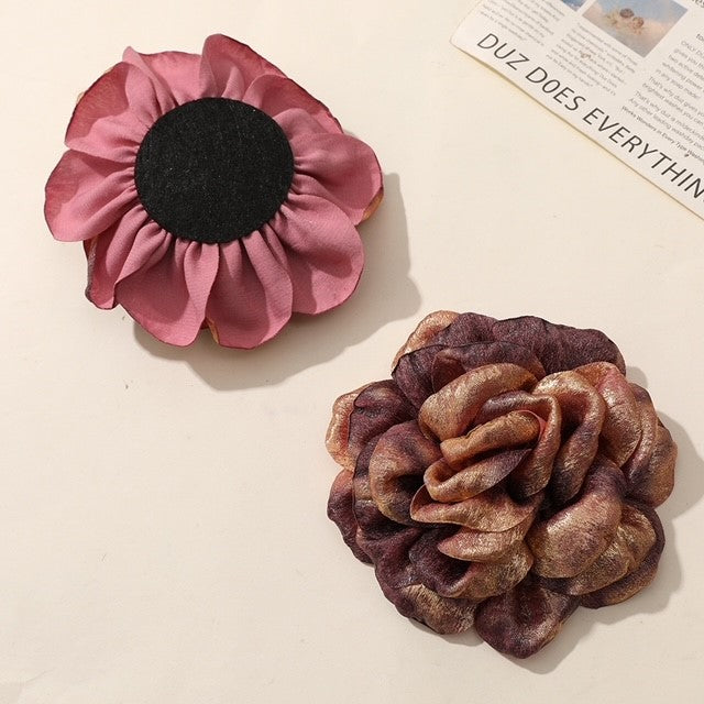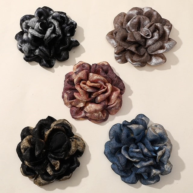 These artisanal fabric flower brooches make a bold statement with their unique combinations of rich metallic hues. Handcrafted with textured layers, these dimensional blooms are a perfect way to add a touch of personality and artistic flair to any outfit. Elevate your accessory game with these eye-catching pieces.