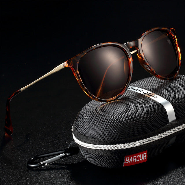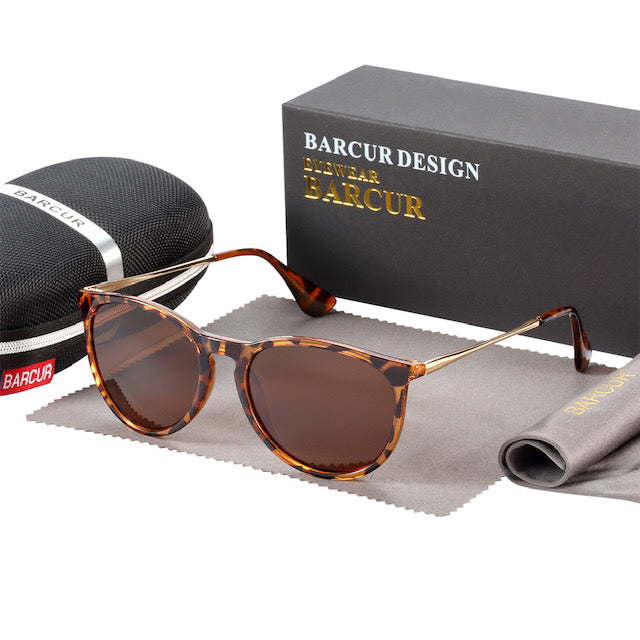 Barcur sunglasses offer stylish and fashionable protection from harmful UV rays. The round frame is detailed with a leopard print design while the brown gradient lenses reduce glare. They also feature a folding hinge for convenient storage. Look great at the beach, a night out, or any occasion.