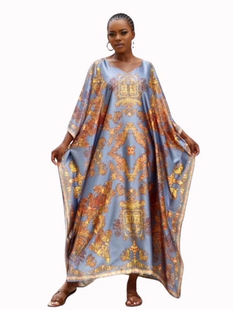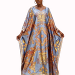 This cotton summer dress features an abstract print of swirls, stripes, and dots in shades of orange, teal, and gray. The wide, three-quarter length sleeves flow from the shoulders, adding a touch of elegance. The fitted bodice and gathered waist create a flattering silhouette, while the full, floaty skirt adds movement and drama. Perfect for any summer occasion, this dress is sure to make a statement.