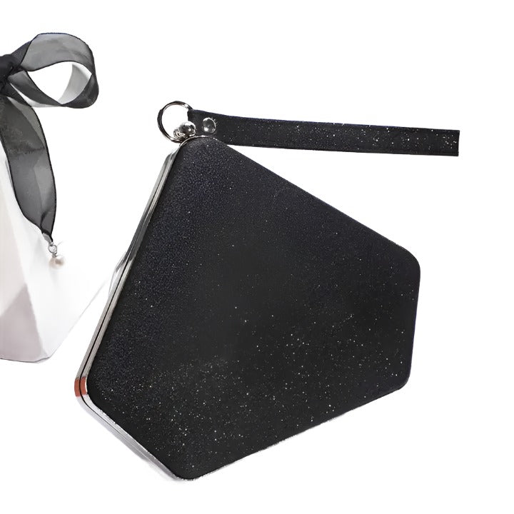 Add a touch of sparkle and shine to any ensemble with this glamorous sequined purse box. Crafted with a silver frame and clasp closure, the rectangular shape and rounded edges evoke sophistication and class. For added convenience, the bag also includes a black wrist strap with a silver clasp.