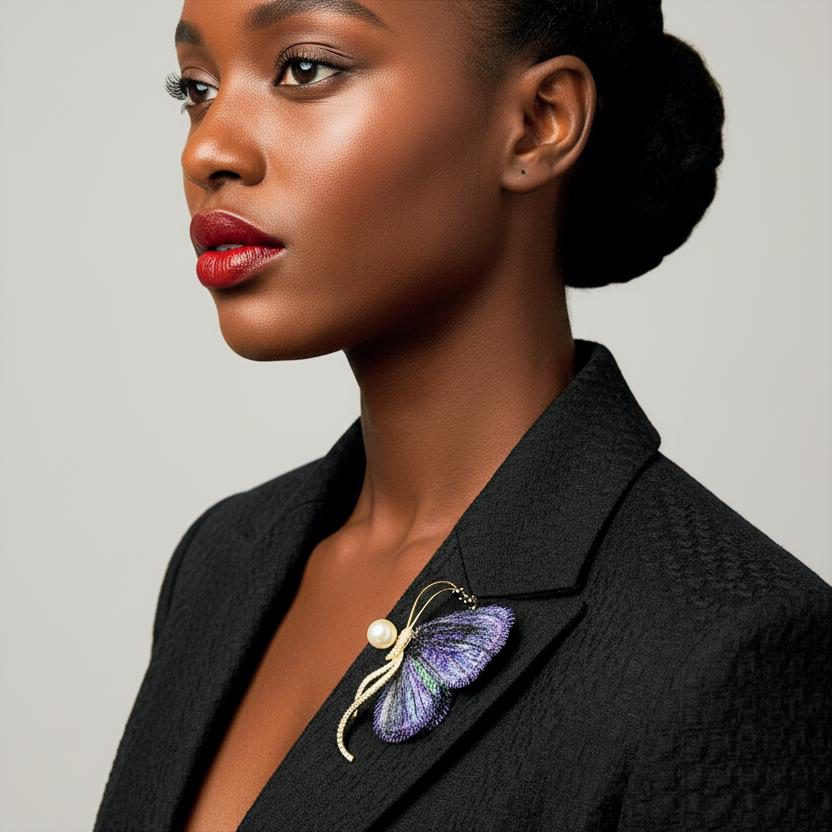 Whimsical butterfly brooch featuring textured purple and lavender fabric wings with gold-toned pavé crystal body, pearl accent, and wire antennae with black bead tips.
