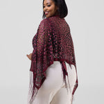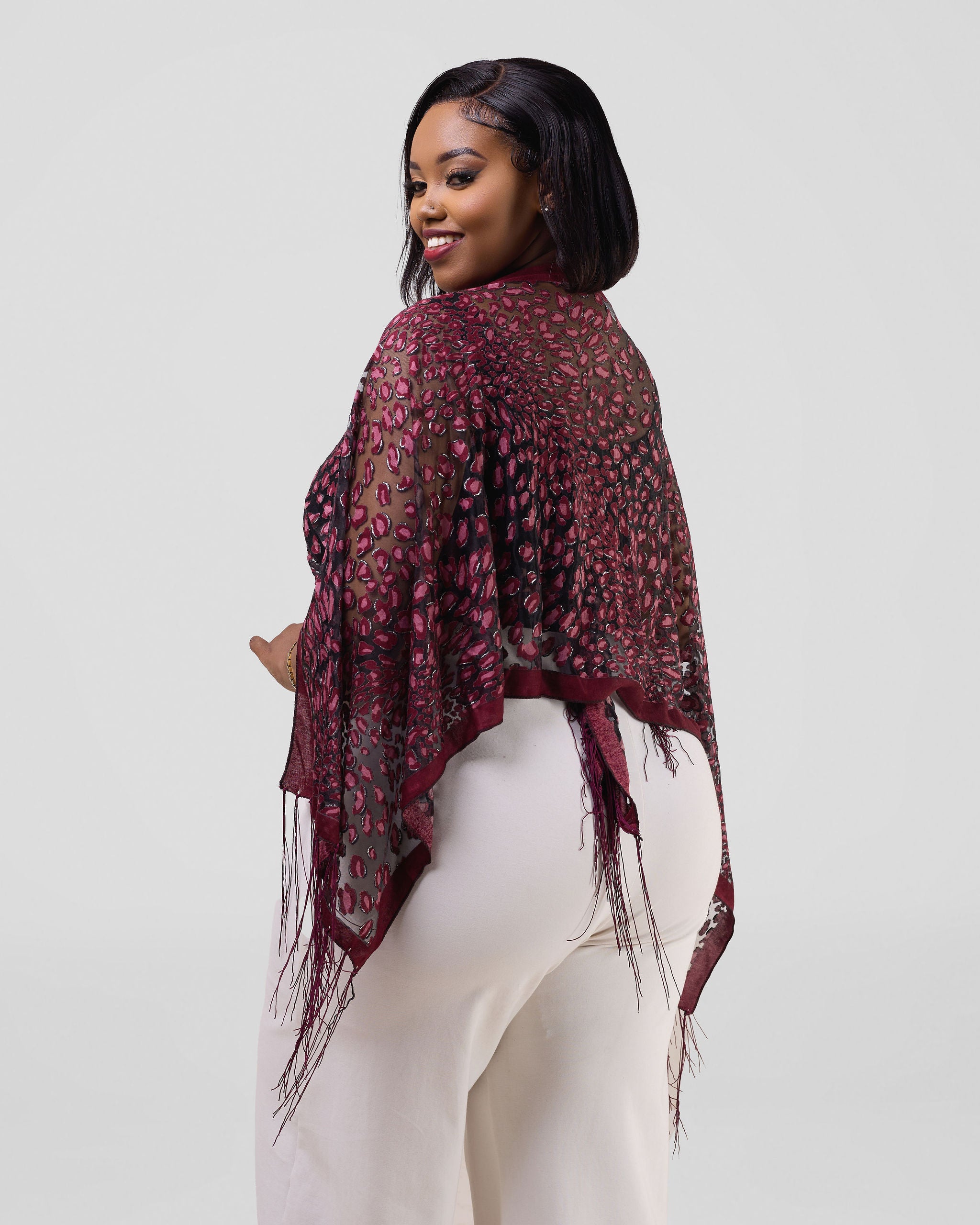 This bold cape-style poncho showcases a rich burgundy base with a striking leopard print on lightweight, sheer fabric. Designed with off-shoulder sleeves and a fringe hem, it offers a refined, wild flair.