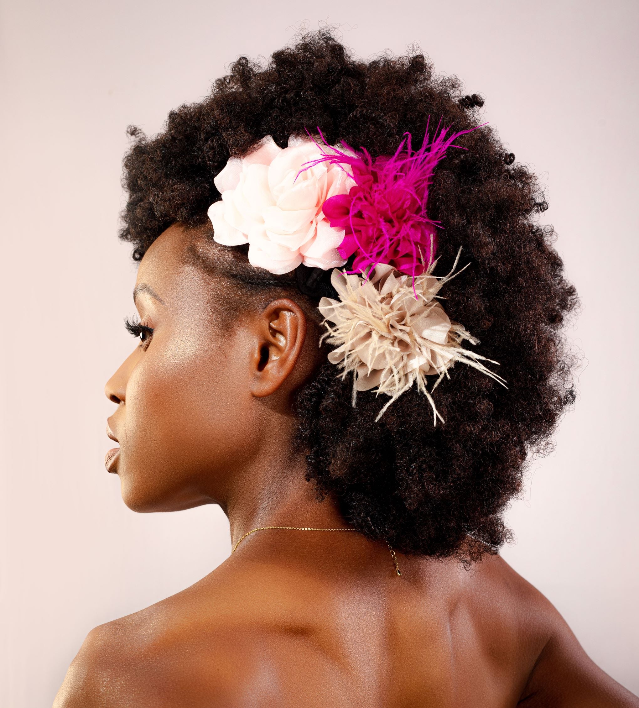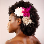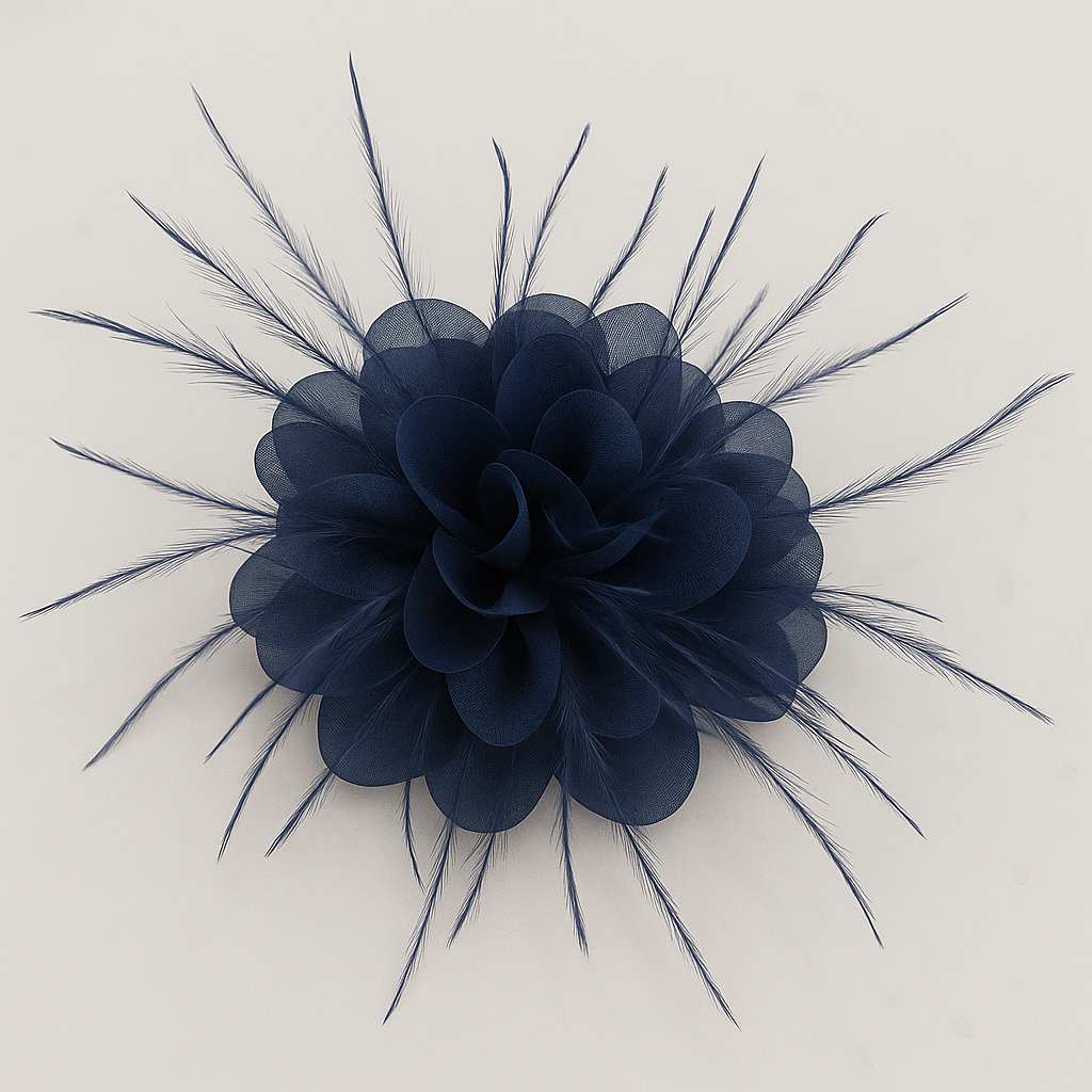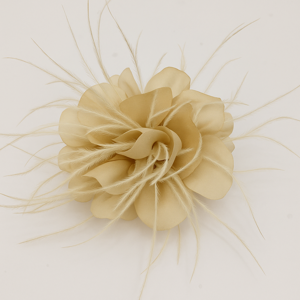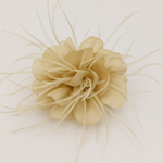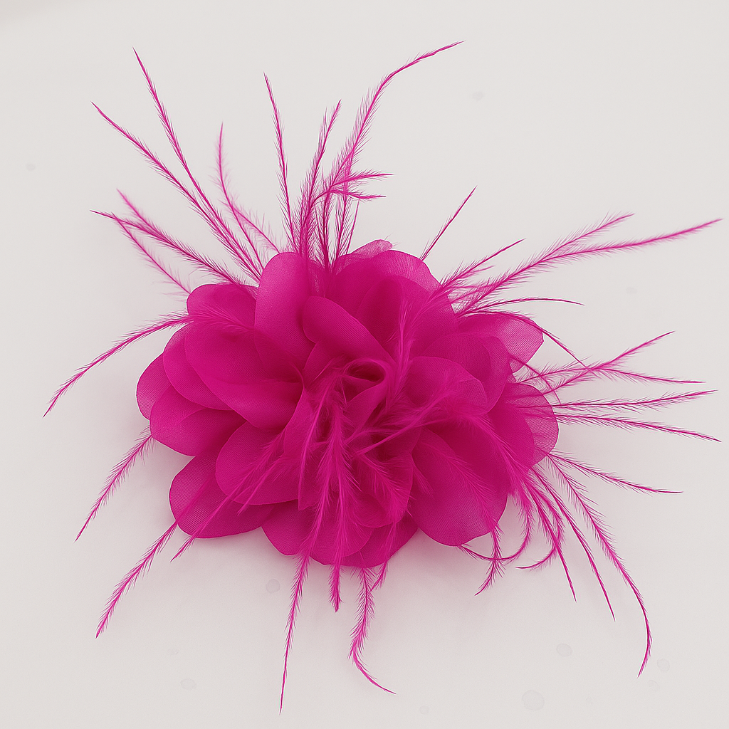 This large feather brooch showcases a coral fabric flower with delicately layered petals, surrounded by a vibrant halo of bright colors, wispy feathers. Its refined design adds a sophisticated pop of color and texture, making it an elegant accessory to elevate any outfit with expert craftsmanship and style.