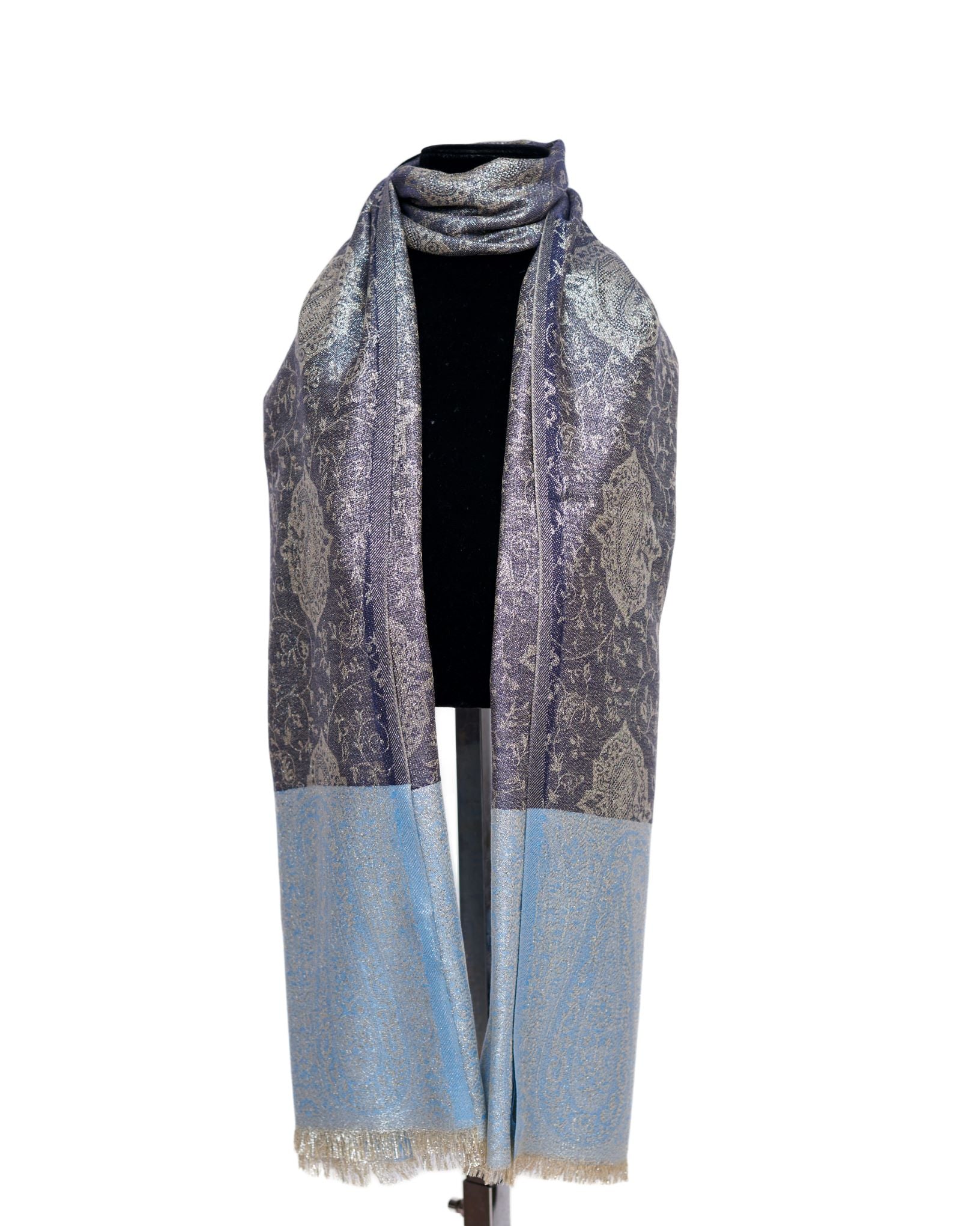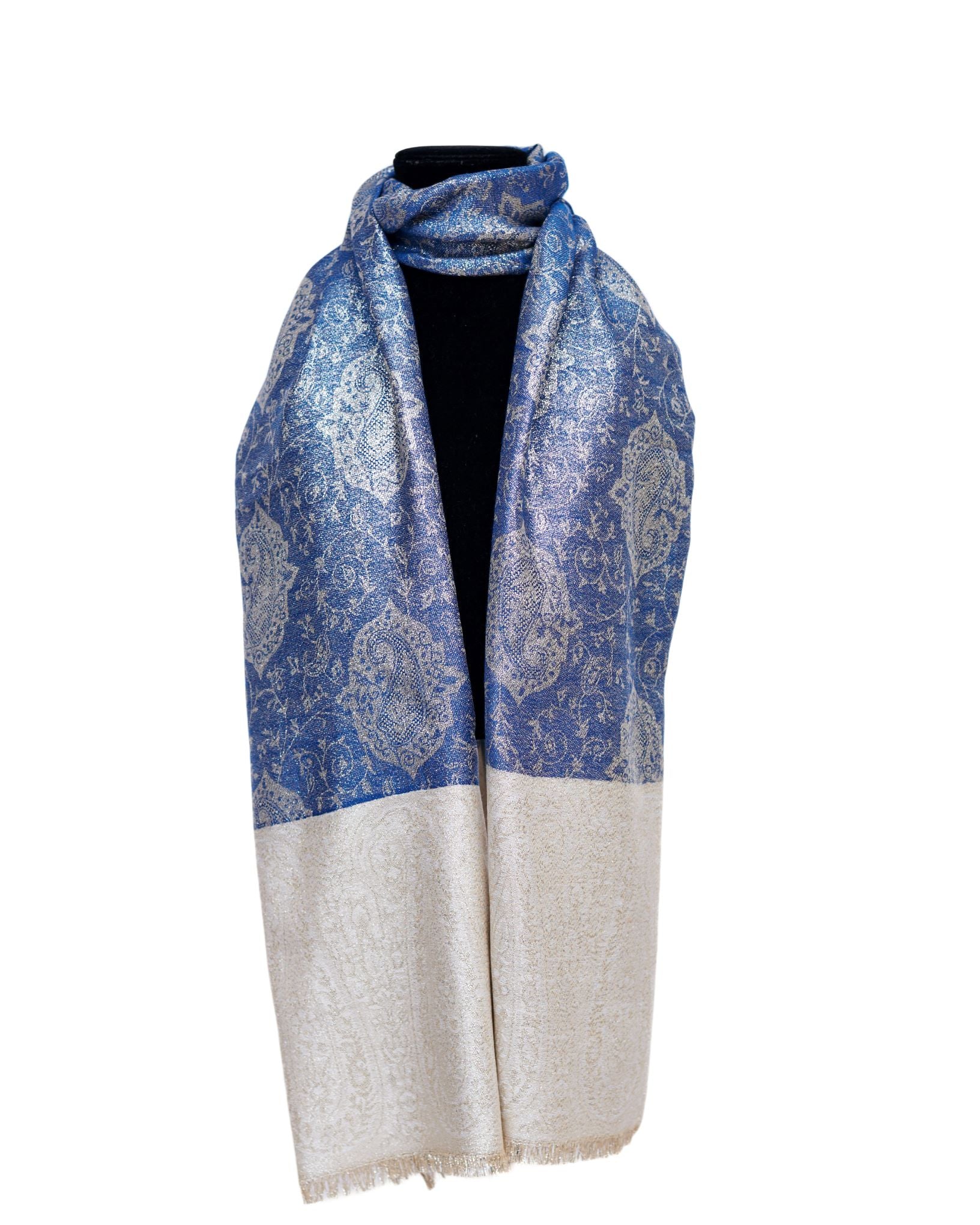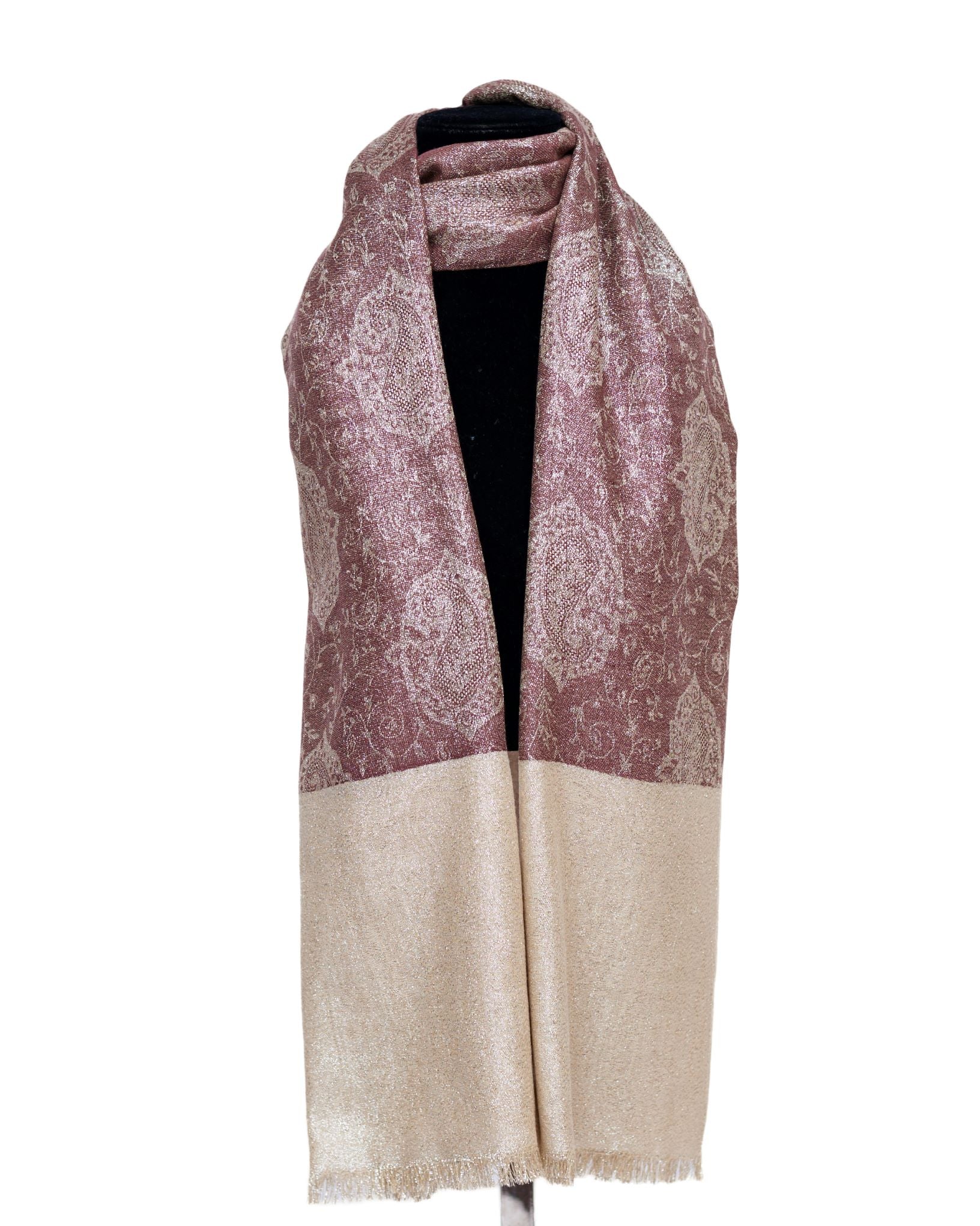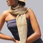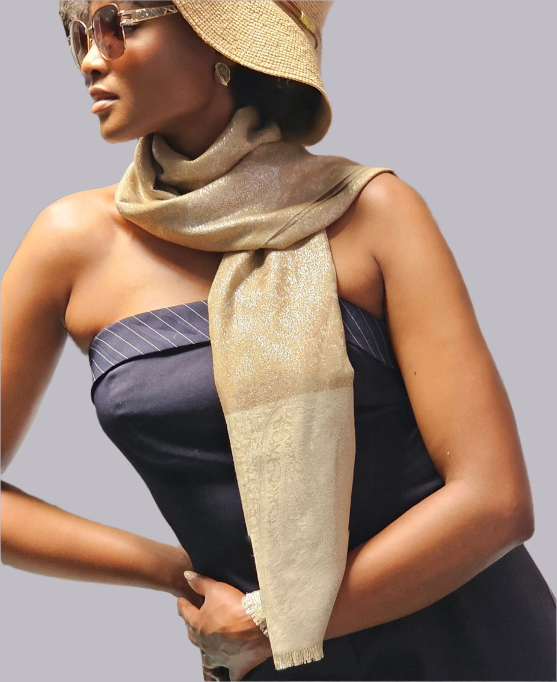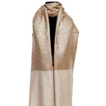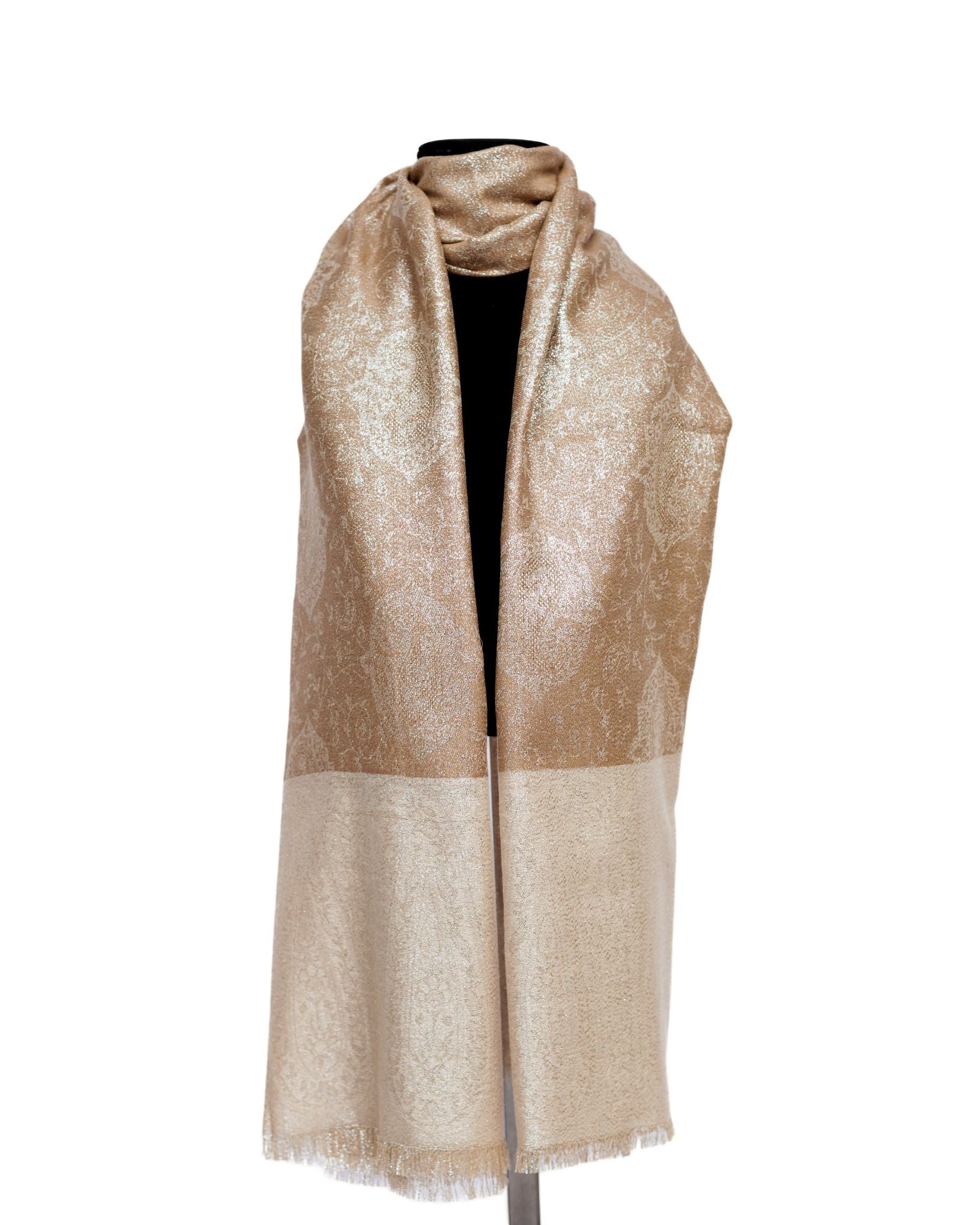 Indulge in luxury with our Light Cashmere Scarf. Made from a soft fabric, this scarf adds a subtle touch of elegance to your wardrobe. Its gentle sheen and warmth make it a versatile accessory for any occasion. Elevate your style and comfort with our Cream and Gold Toned Scarf.