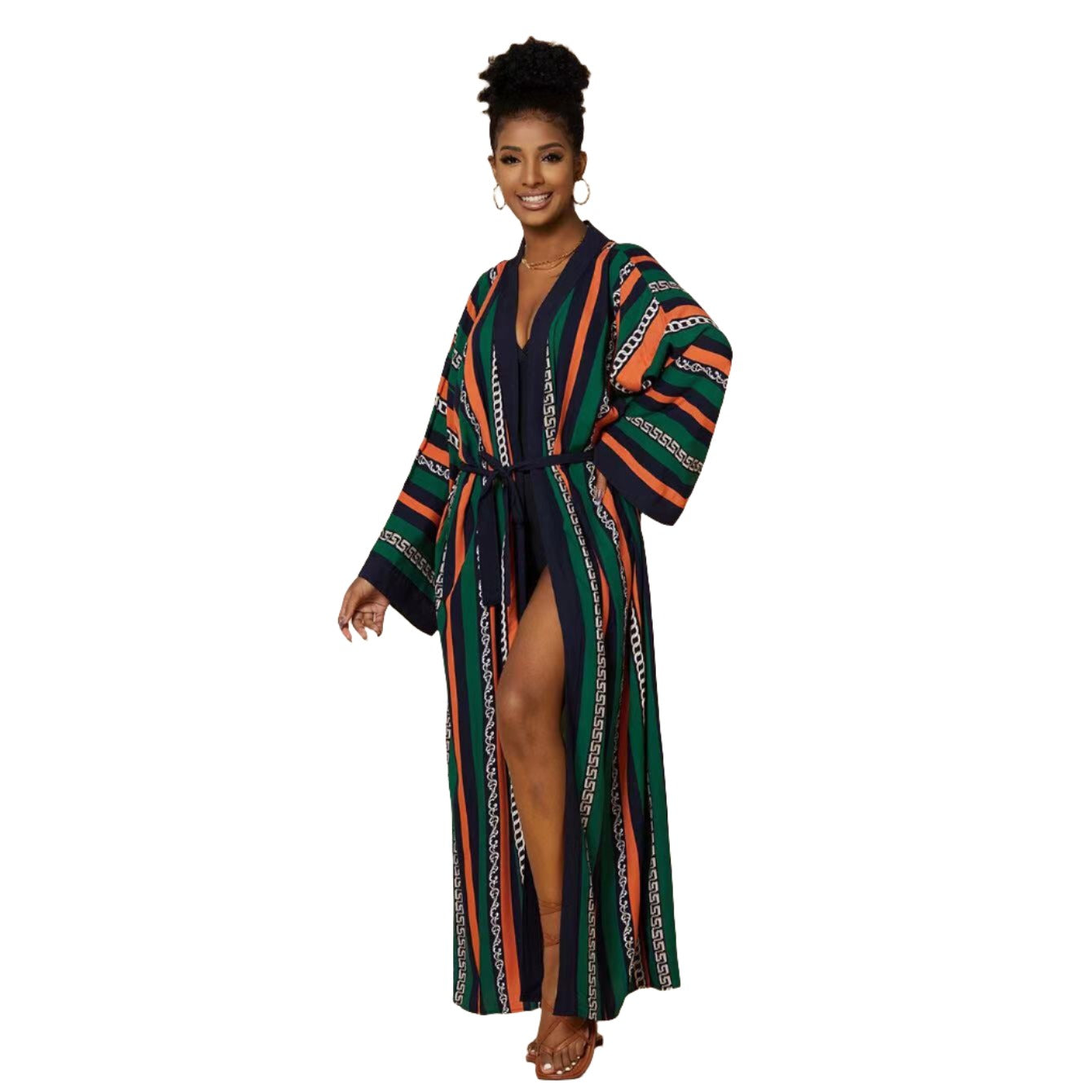 Unleash your inner fashionista with our Long Open Kaftan! This stunning robe-style dress features vibrant vertical stripes in dark blue, green, and orange, accented with white. The wide sleeves and plunging V-neckline create a flattering silhouette, while the fabric belt cinches the waist. Make a statement with the consistent stripe pattern and stand out from the crowd!