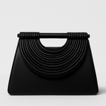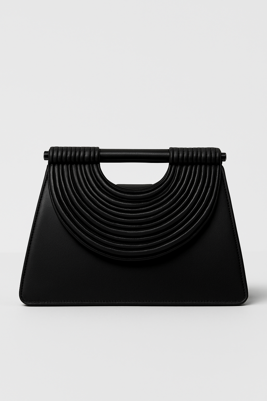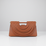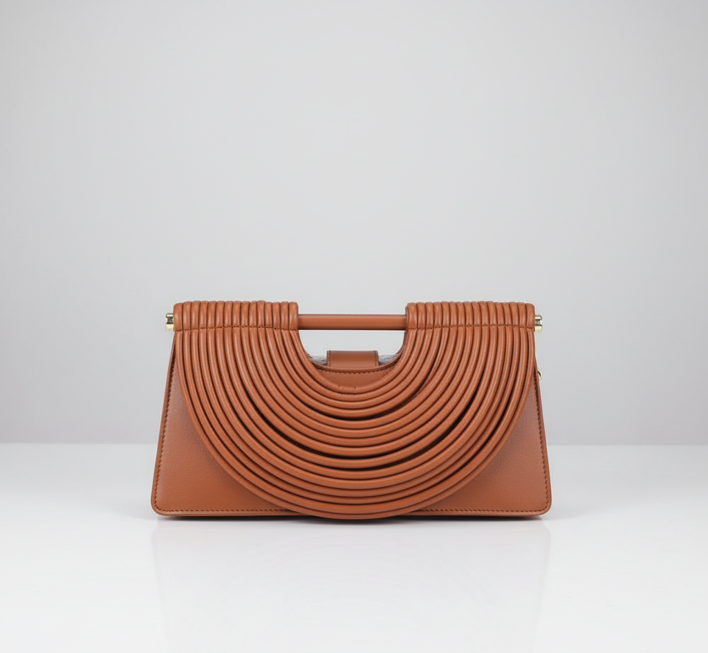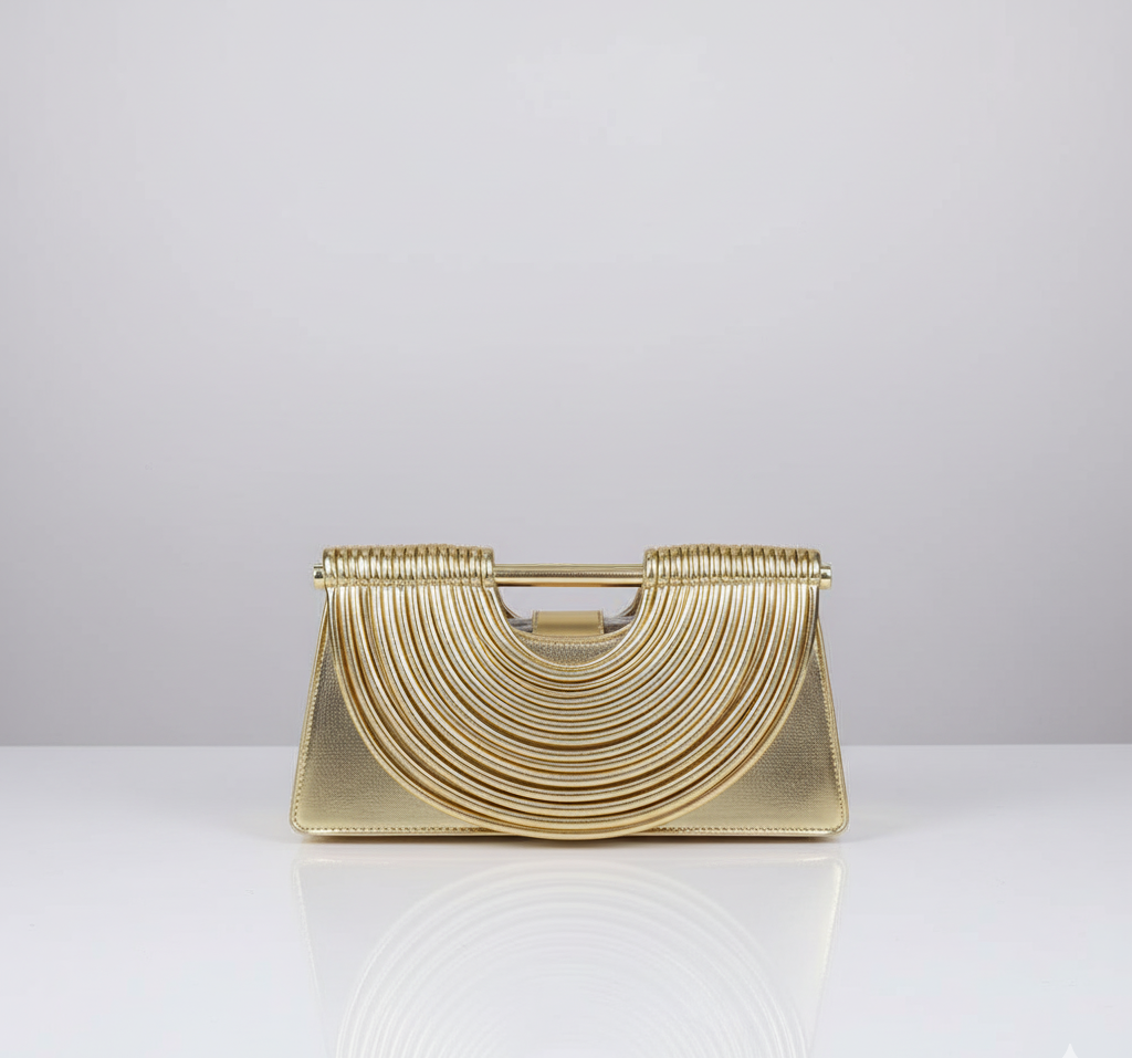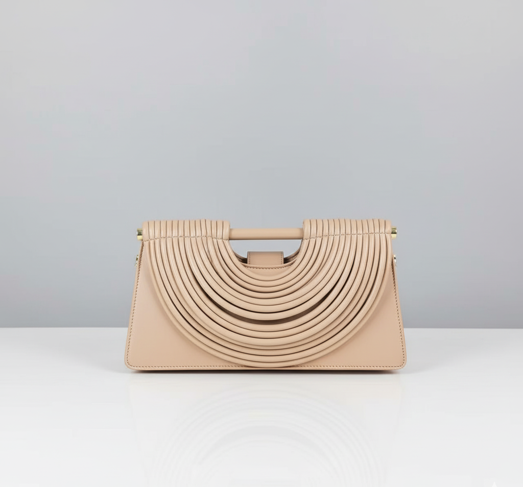 This stylish clutch bag showcases a structured, fan-inspired design crafted from premium leather, available in gold, black, brown, and beige. Featuring a sleek handle and modern silhouette, it adds a refined, contemporary touch to any outfit.
