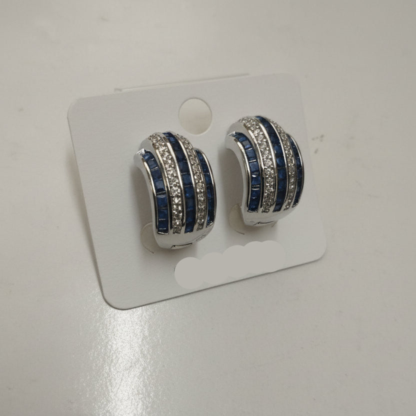Elegant silver-toned curved hoop earrings featuring alternating rows of navy blue baguette crystals and clear pavé stones in a sophisticated striped design.