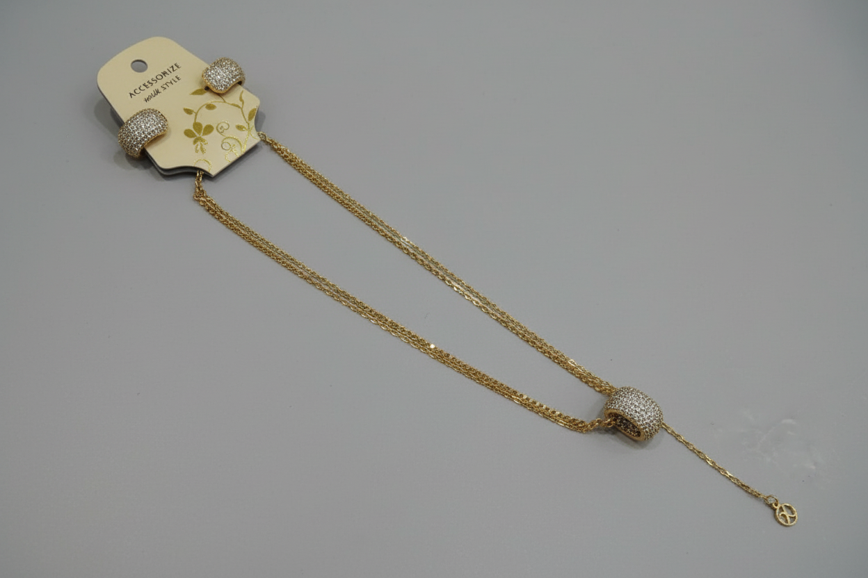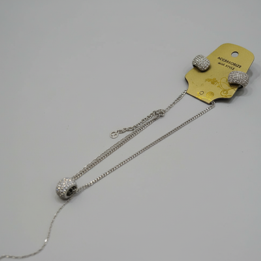 Minimalist jewelry sets featuring pavé crystal ball stud earrings with matching delicate chain necklaces and crystal cube pendants, available in silver-toned or gold-toned finishes.