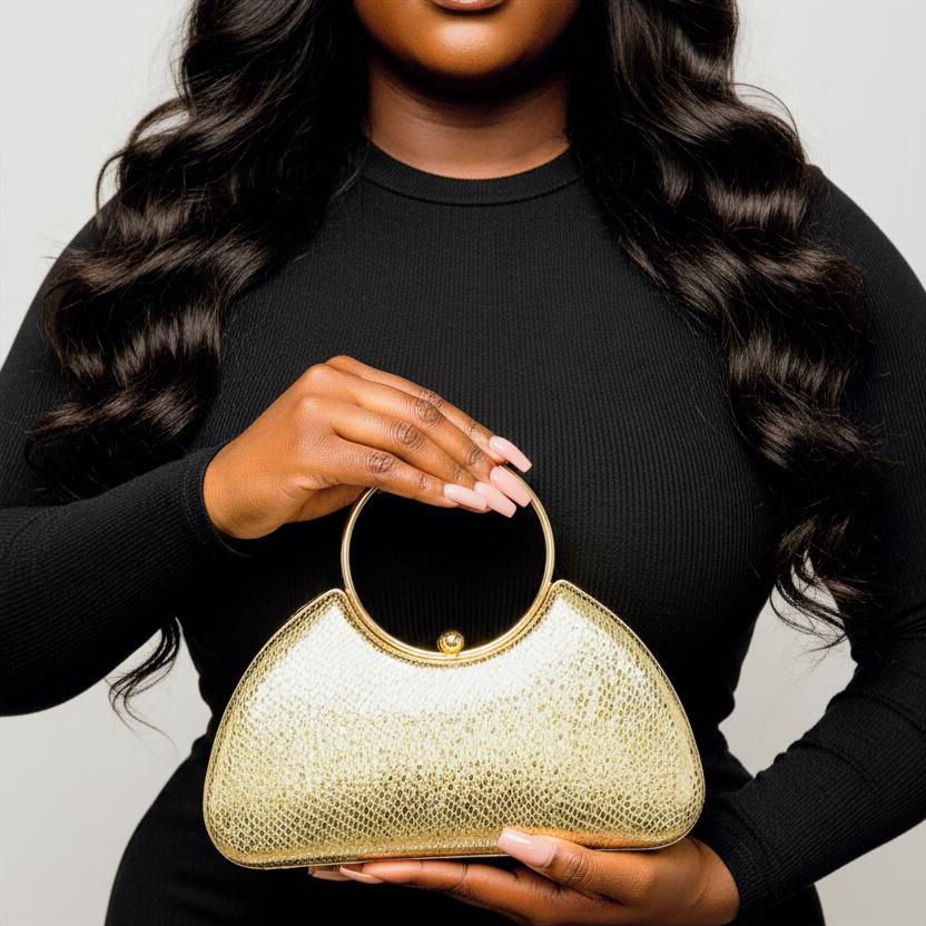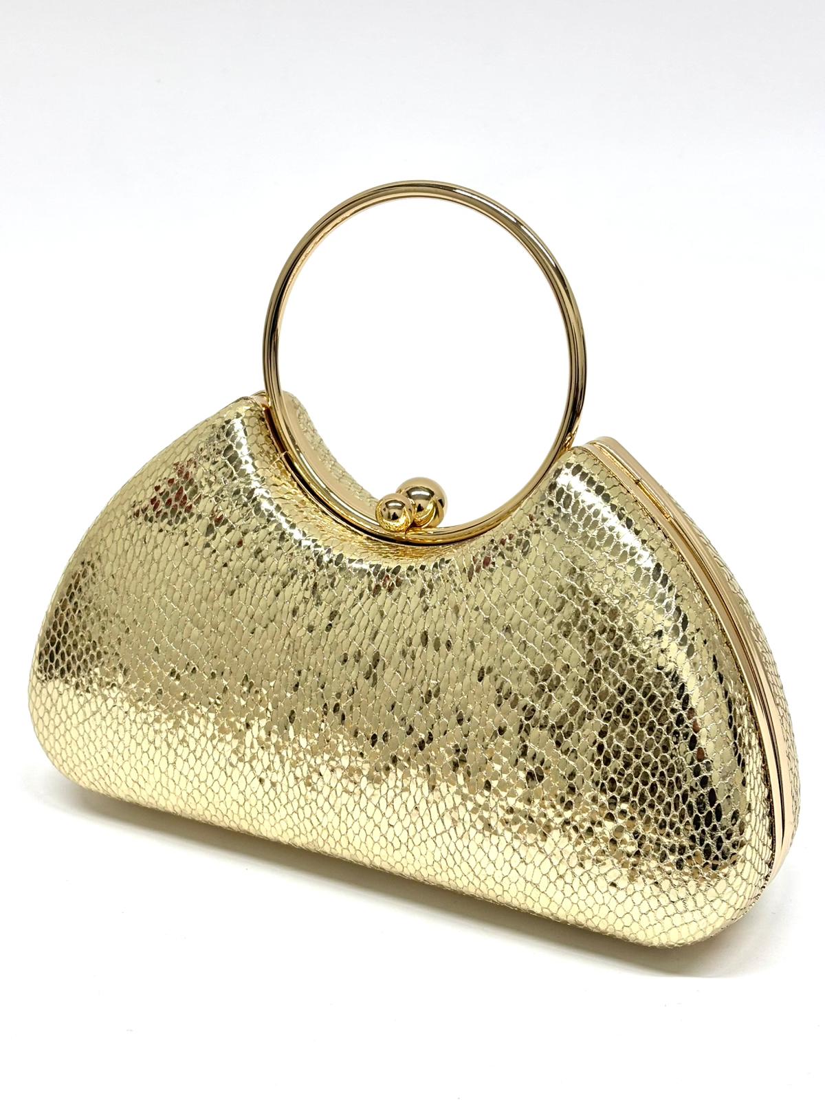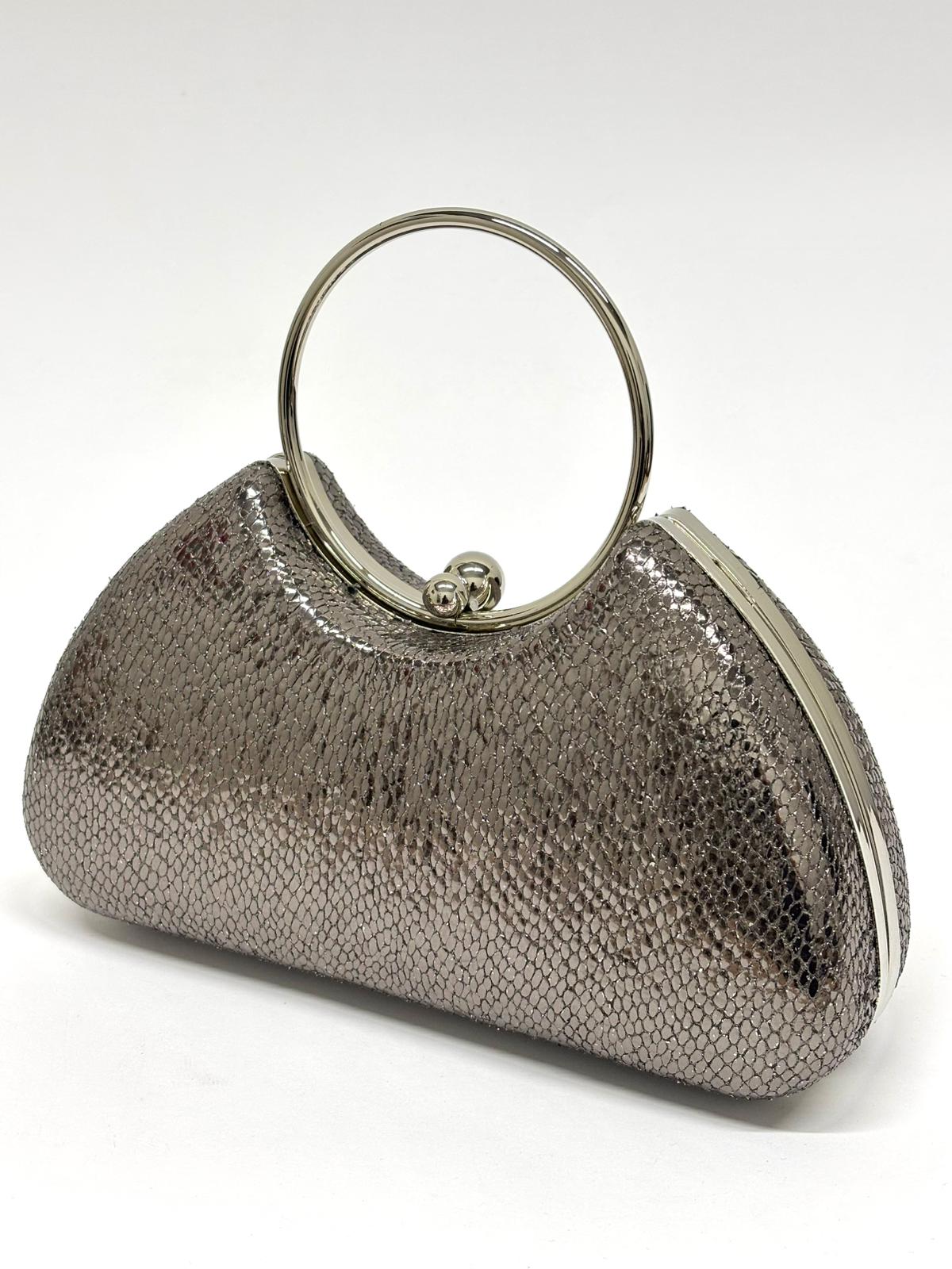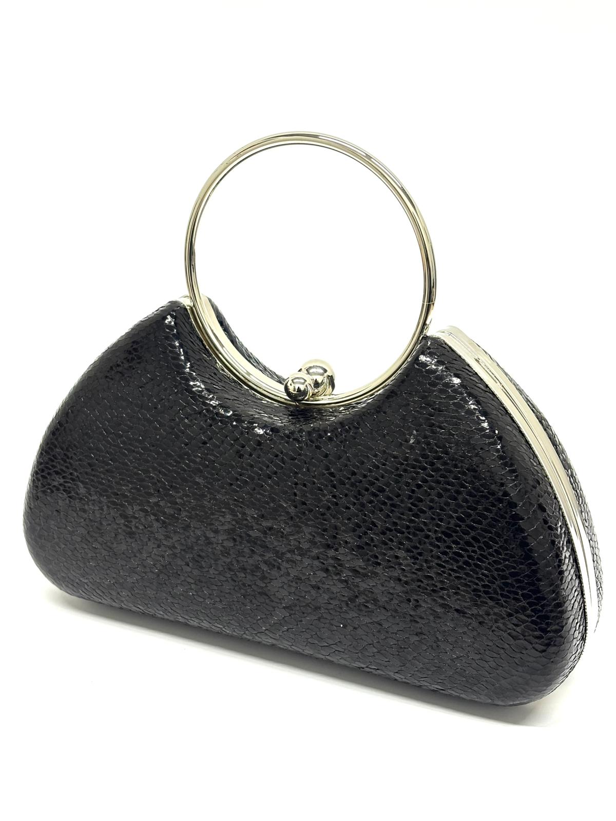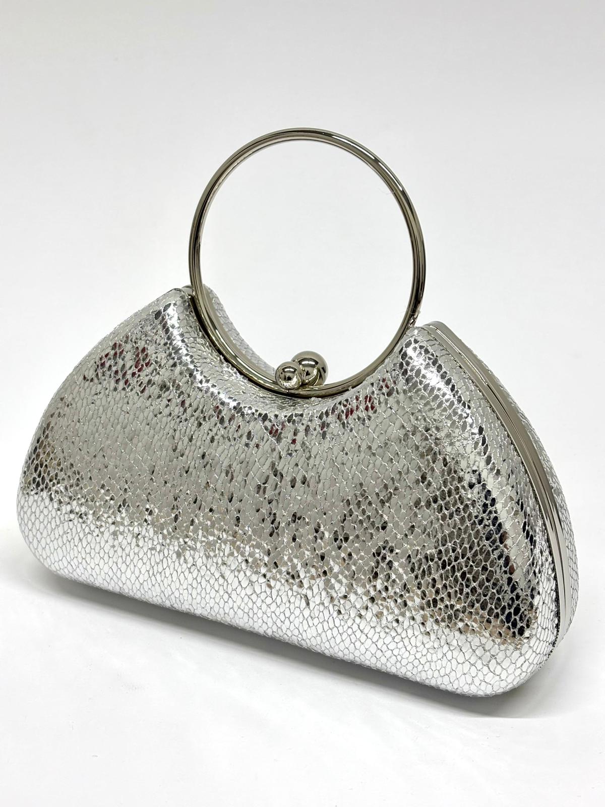 Glamorous snake-embossed evening clutch featuring a structured dome silhouette, sculptural circular metal ring handle, and ball-clasp closure, available in gunmetal, silver, black, and gold.