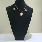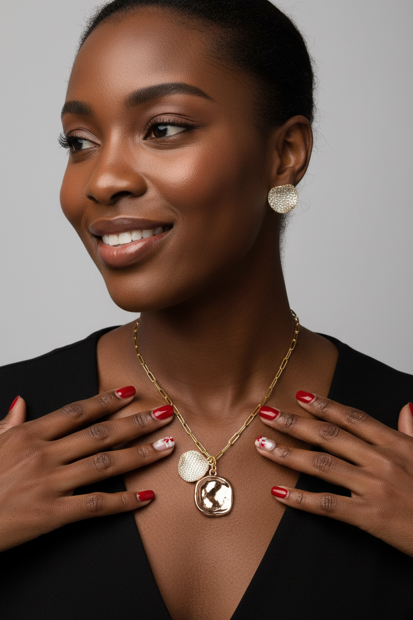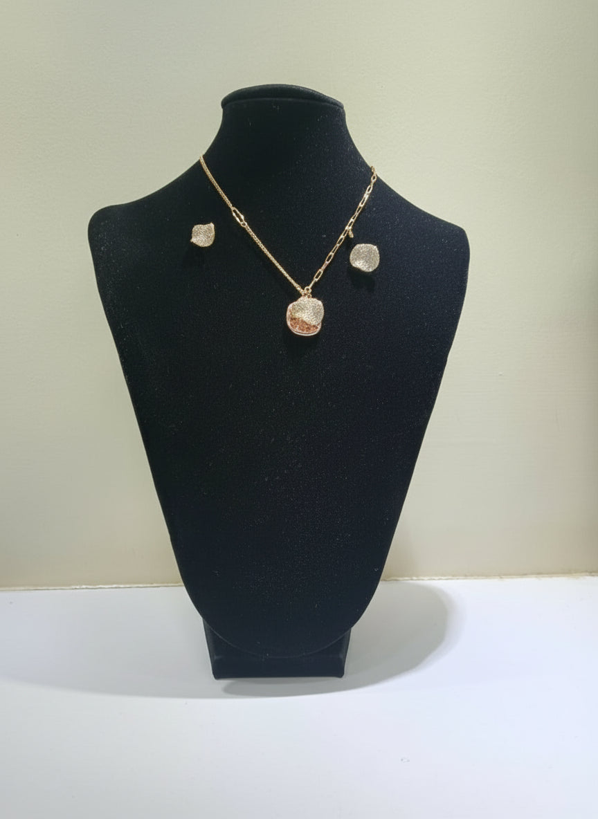 Luxurious gold-toned jewelry set featuring a delicate chain necklace with textured cushion-cut pendant and matching cushion-shaped stud earrings with sparkling pavé crystal detailing.