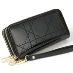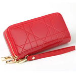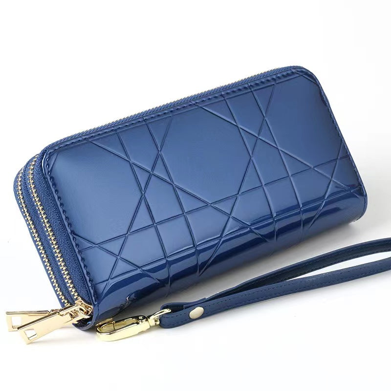 The Premium Purse is a fashionable women's accessory made of glossy patent leather. It features a solid pattern, zipper closure, and a polyester lining. With multiple compartments including slots for cards, a coin pocket, and a cell phone pocket, this compact purse (4.5cm x 19.5cm x 9.5cm) offers stylish organization for your essentials.
