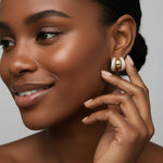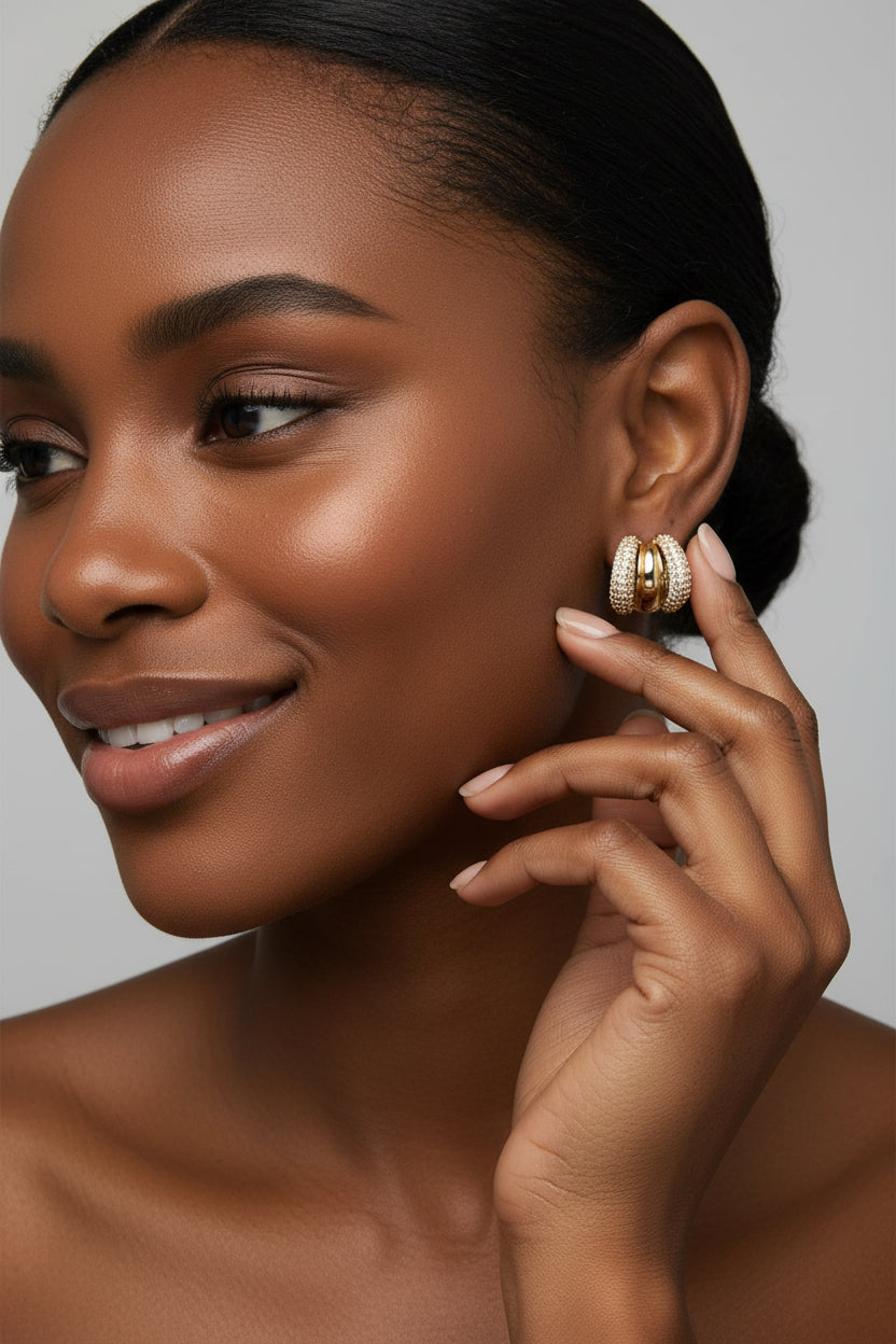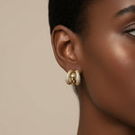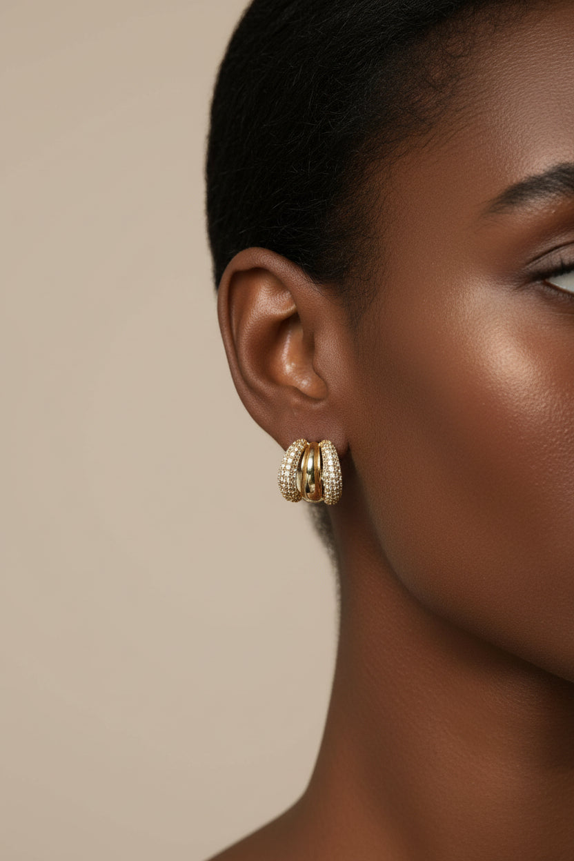 Sophisticated gold-toned triple-hoop earrings featuring a smooth polished center band flanked by two textured pavé crystal-encrusted hoops in a modern stacked design.