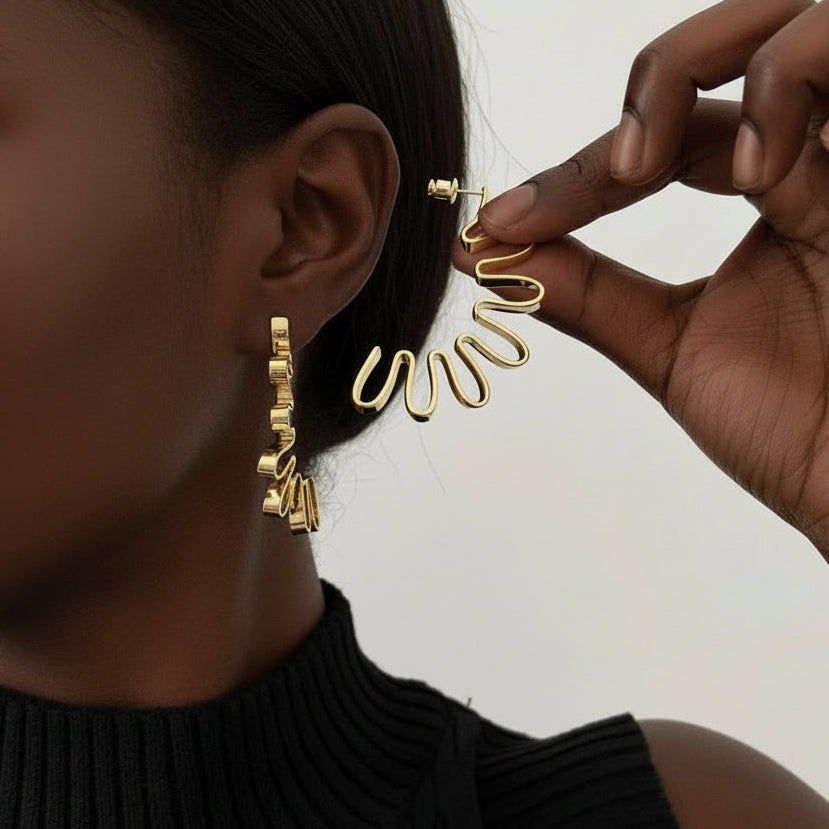 The perfect accessory for making a bold and modern statement. These gold-tone statement earrings feature a unique squiggle design that adds a touch of sophistication to any outfit.