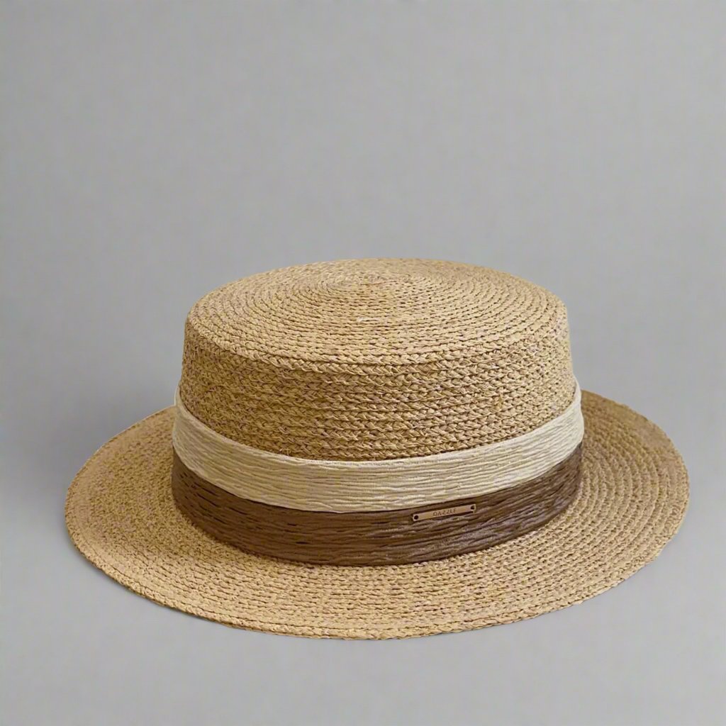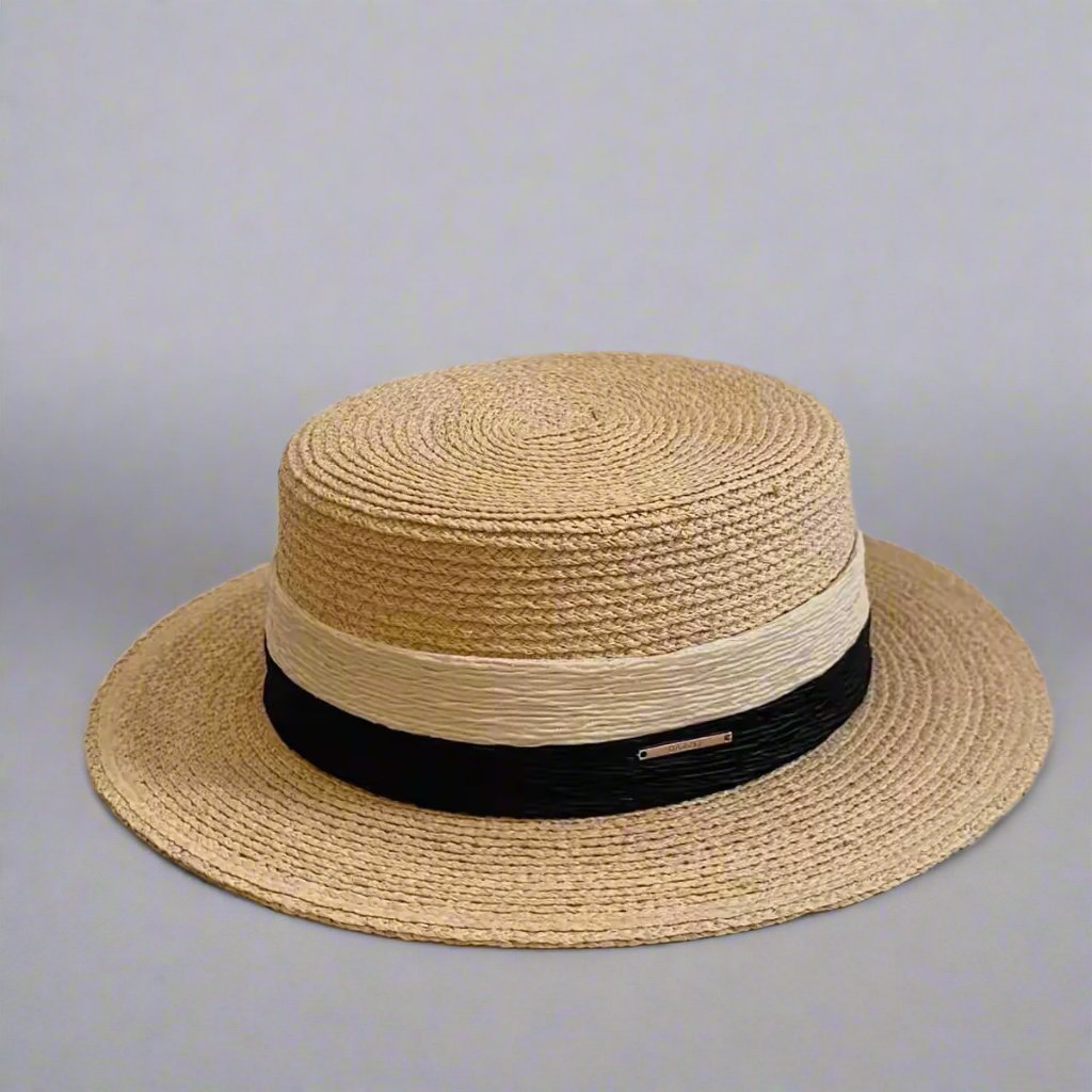 The Queeney Hat is a timeless and versatile accessory for any summer outing. With its classic boater-style design and dual-tone textured fabric band, this straw hat adds a touch of sophistication to any outfit. Perfect for outdoor events or a casual yet stylish look.