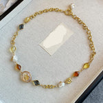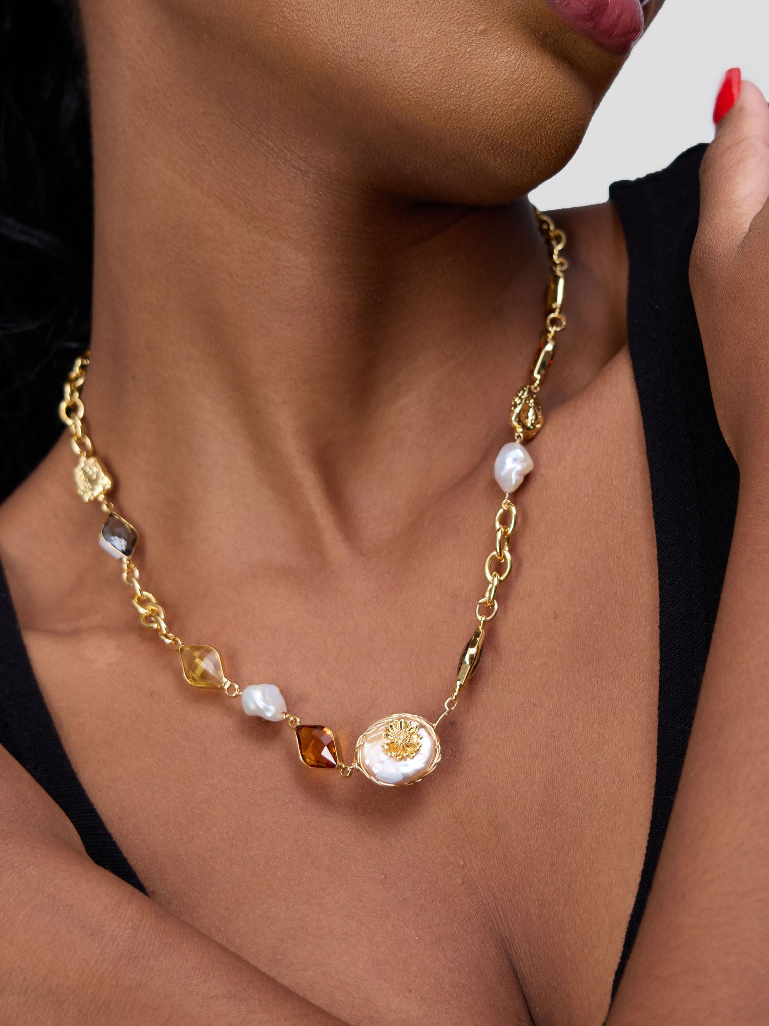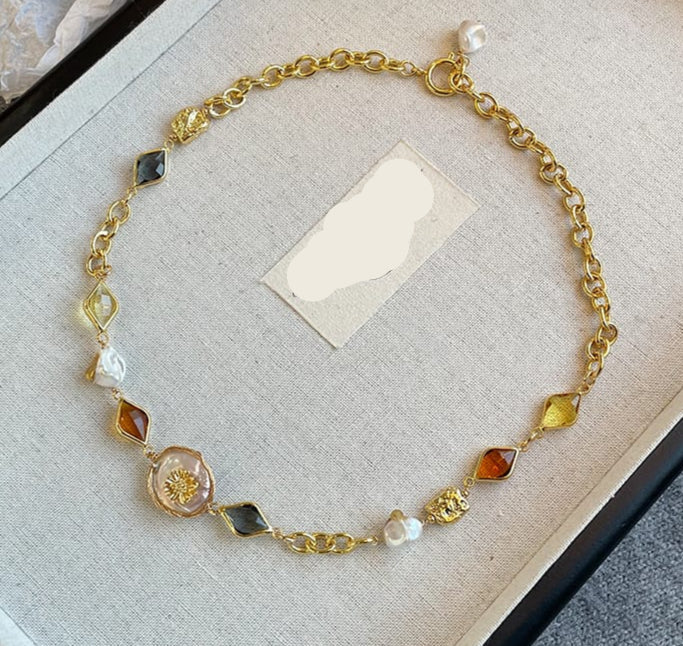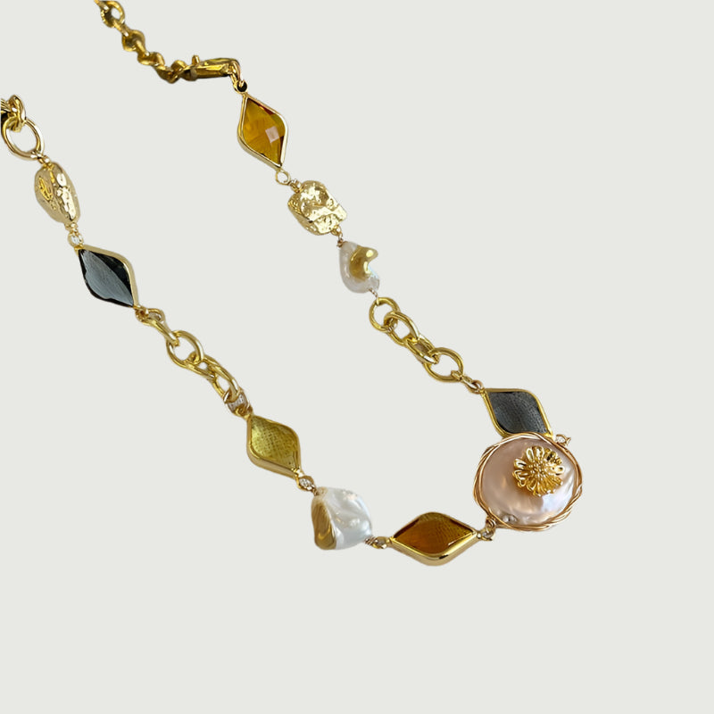This statement necklace features a gold-toned chain with large, oval-shaped links and a variety of beads. The amber beads offer a rich, golden-brown color while the smaller, white pearls offer a contrast in texture. The addition of dark, possibly black, faceted beads and a larger, round, floral bead add to the bohemian or artisanal feel. Elevate your style with this unique and versatile piece.