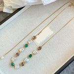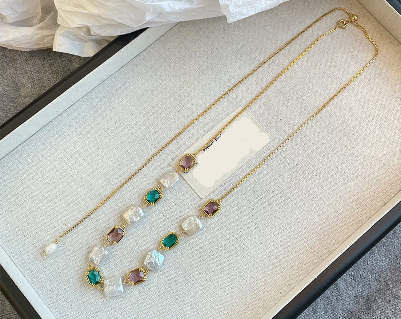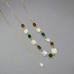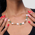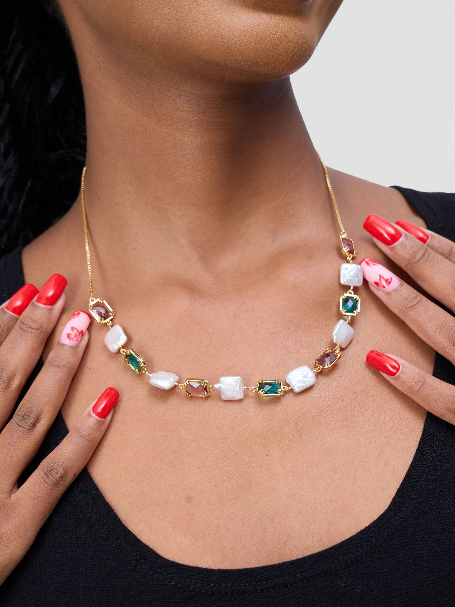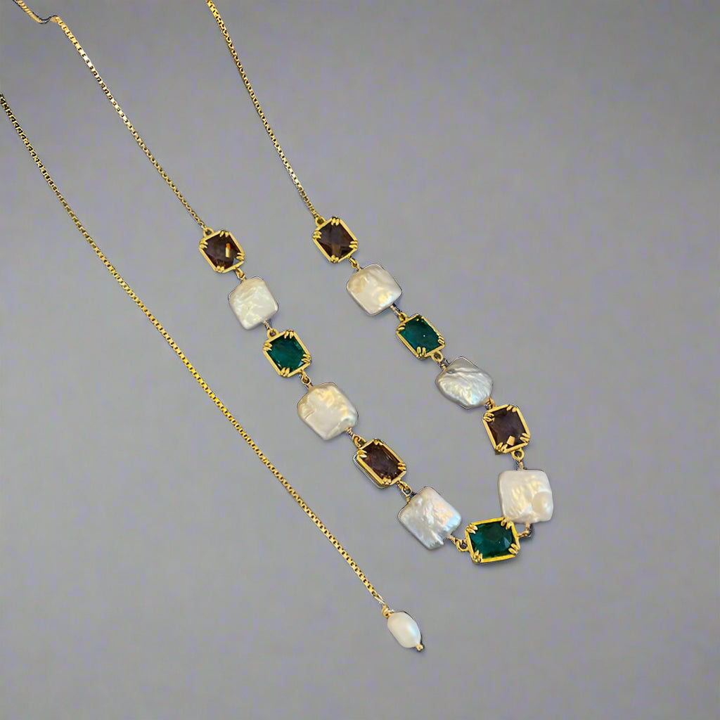 Add a touch of elegance and femininity to your outfit with this statement necklace. Featuring alternating square beads in emerald green and creamy white, bezel-set in gold-toned frames and connected by a thin gold chain. The classic and chic aesthetic is perfect for any occasion.