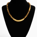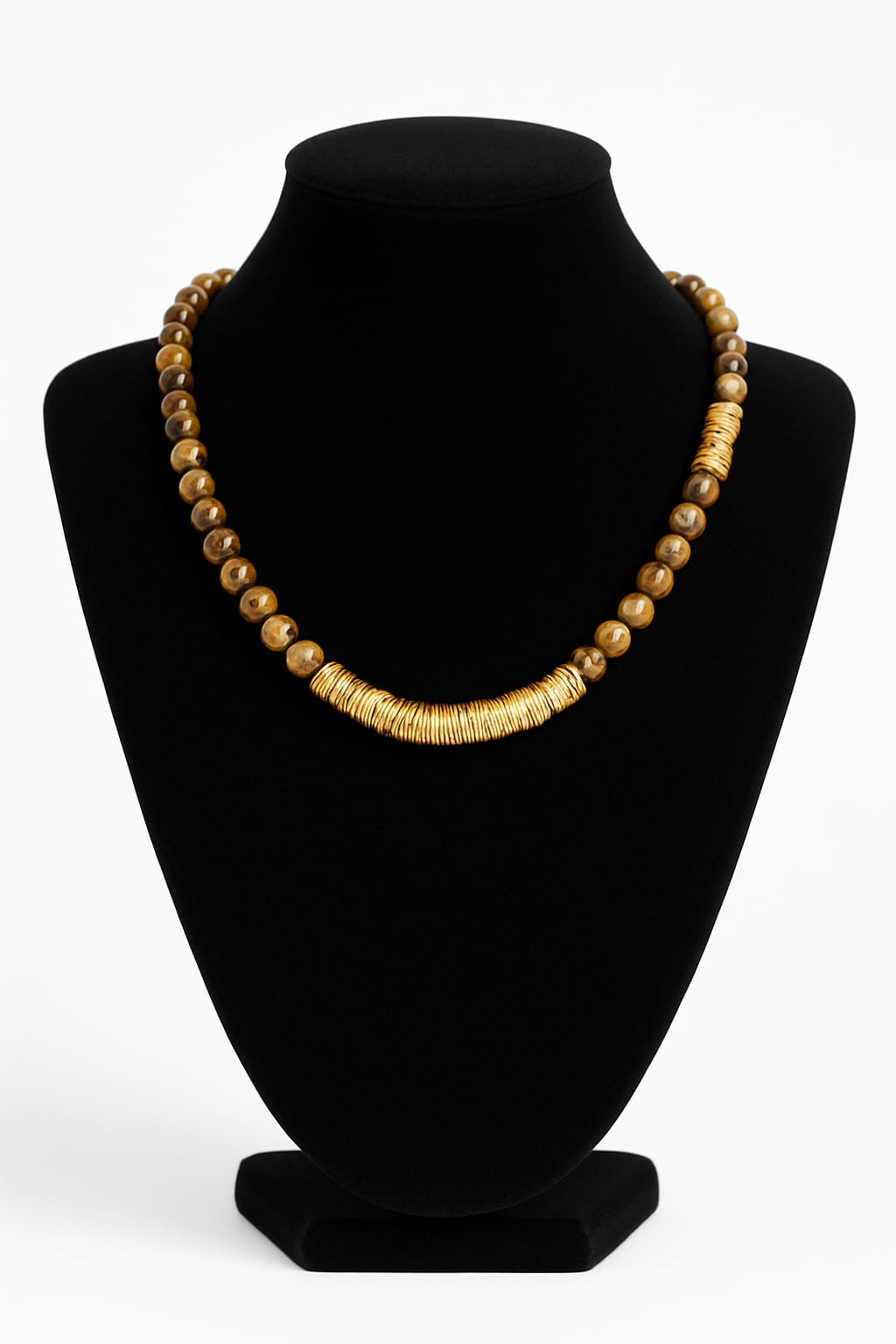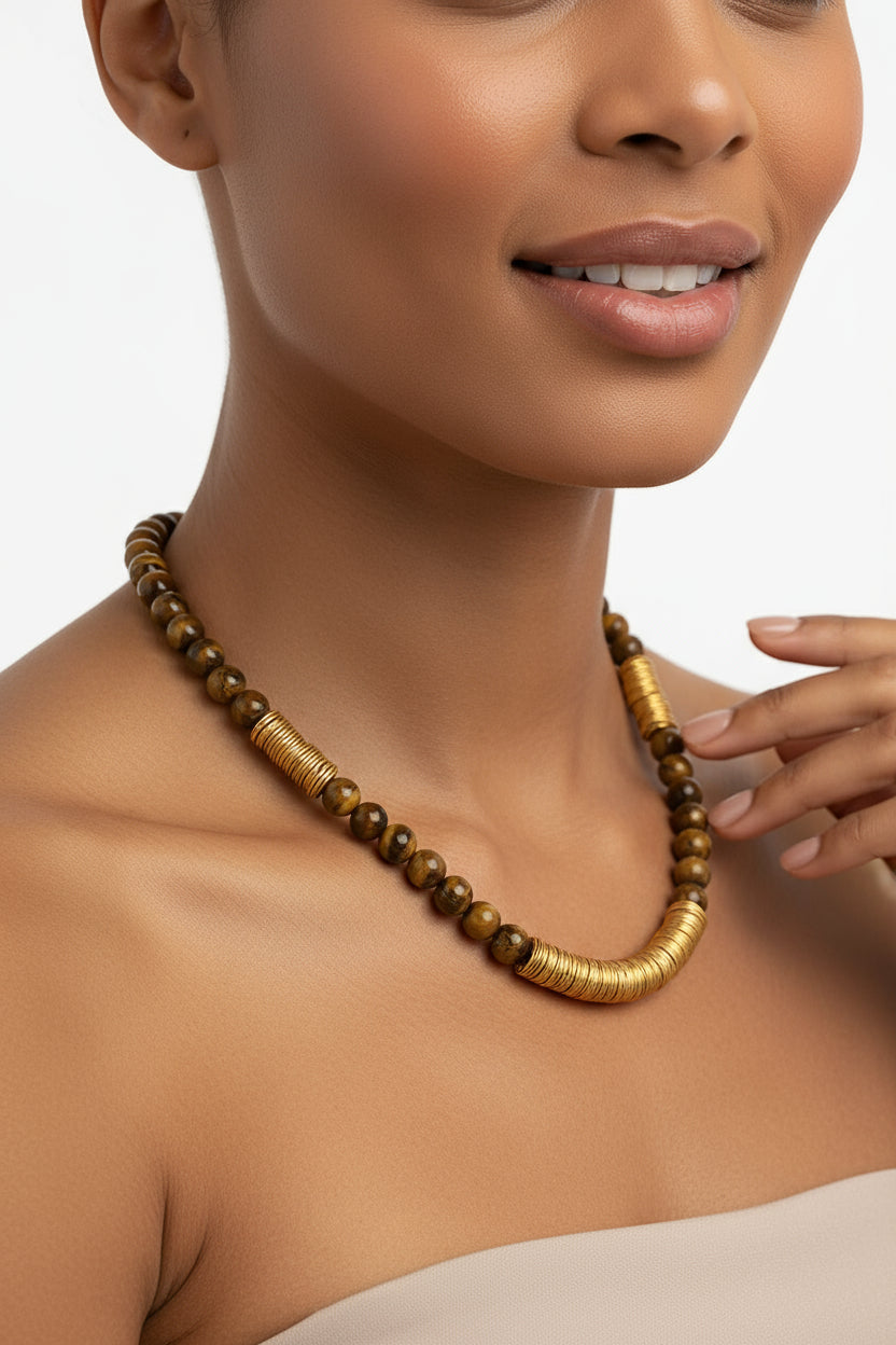 This bold choker necklace features polished tiger’s eye beads framing a striking centerpiece of stacked gold-tone ribbed rings.