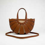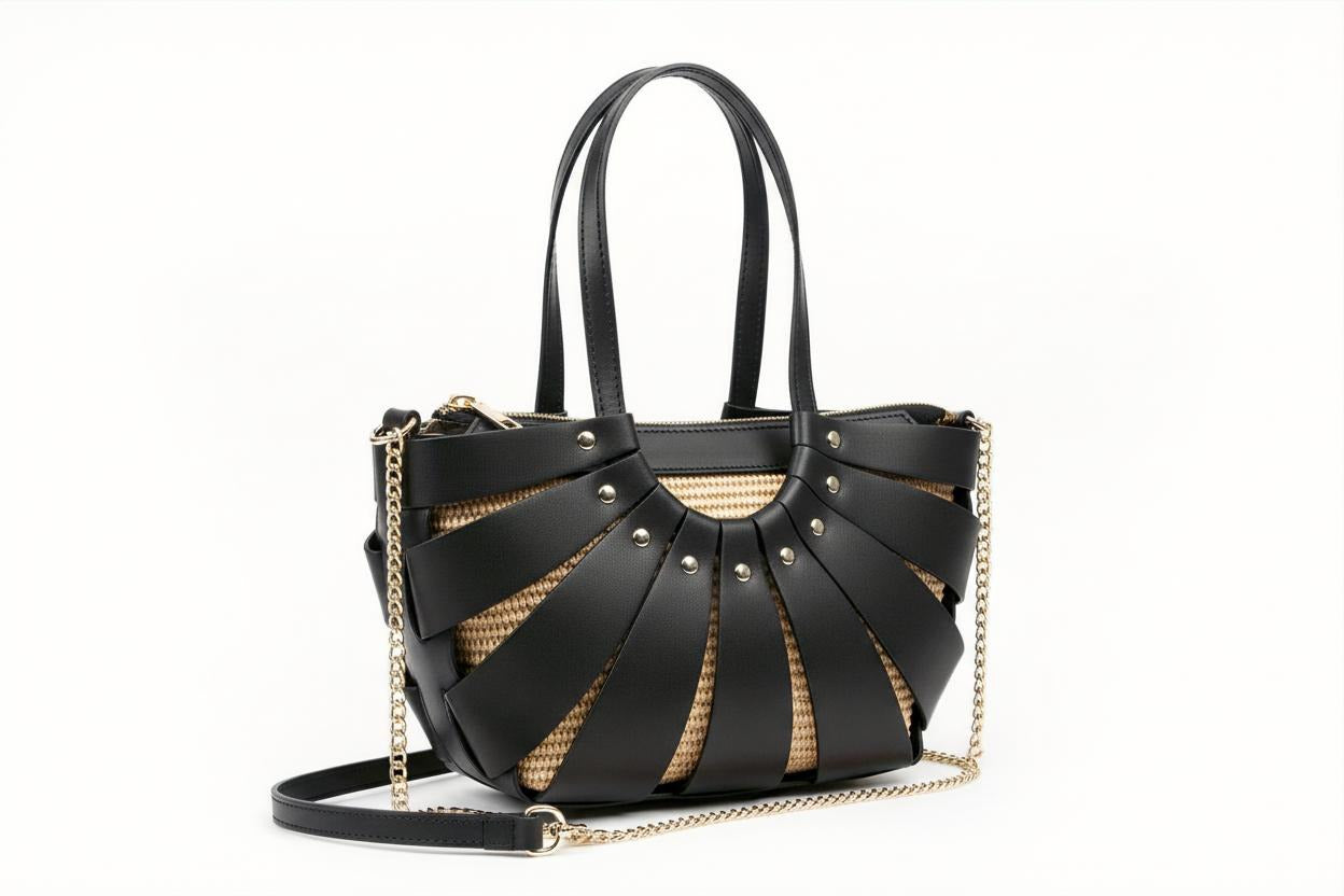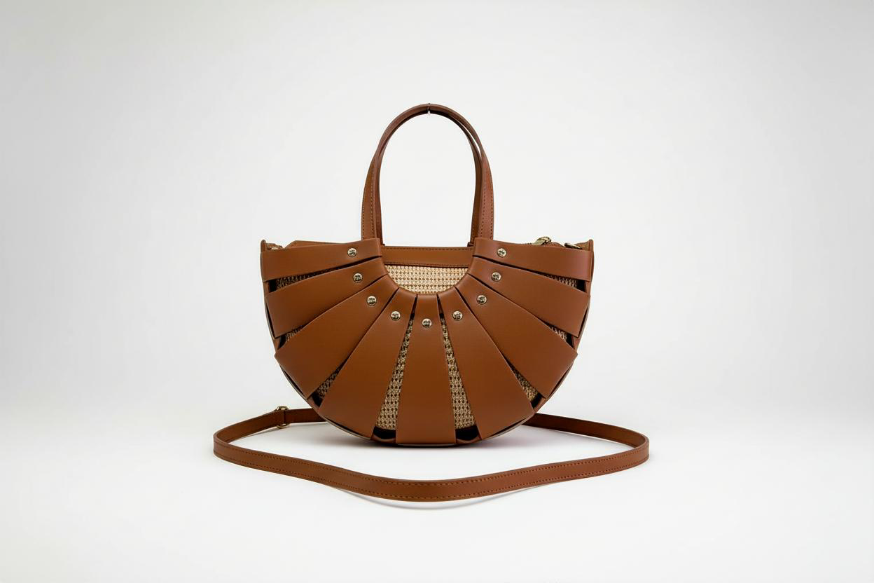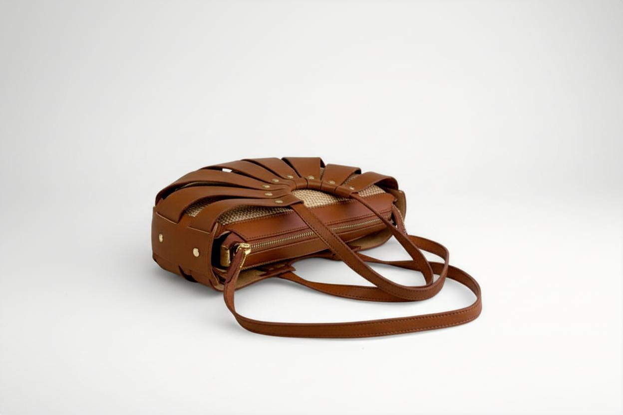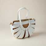 Statement half-moon bag featuring sculptural radiating faux leather panels with woven raffia insets, gold-toned stud accents, and removable crossbody strap.