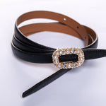 - Style Details: Imitation pearl and rhinestone embellished belt buckle; gold tone hardware; polyurethane keeper