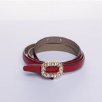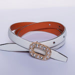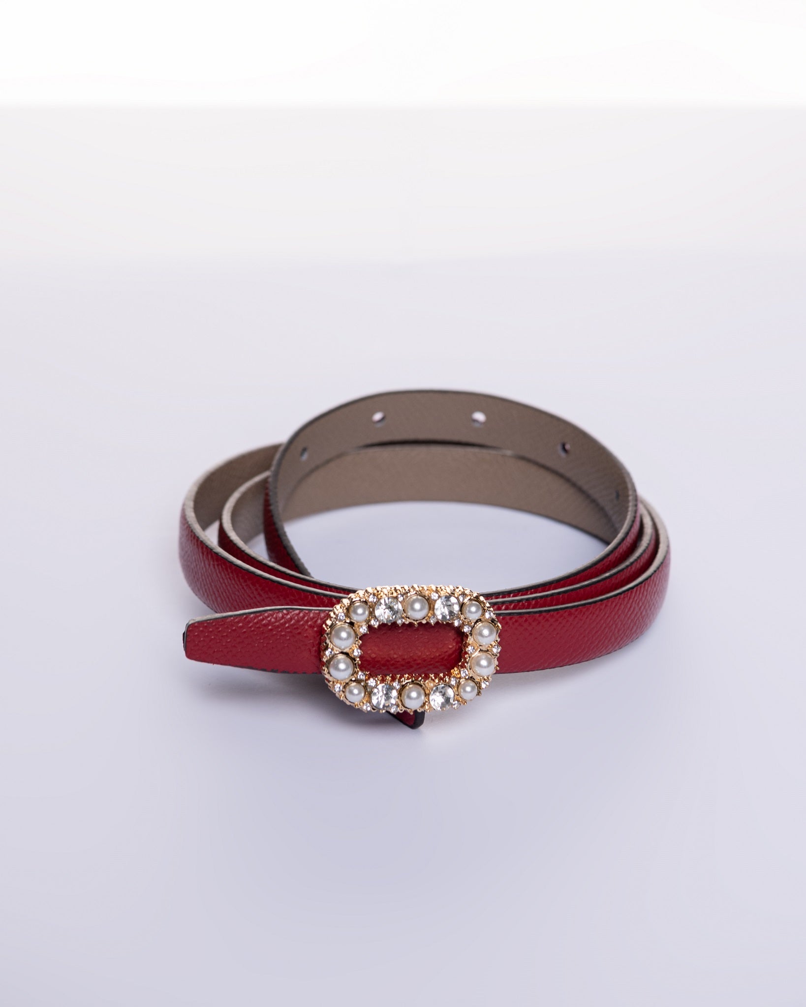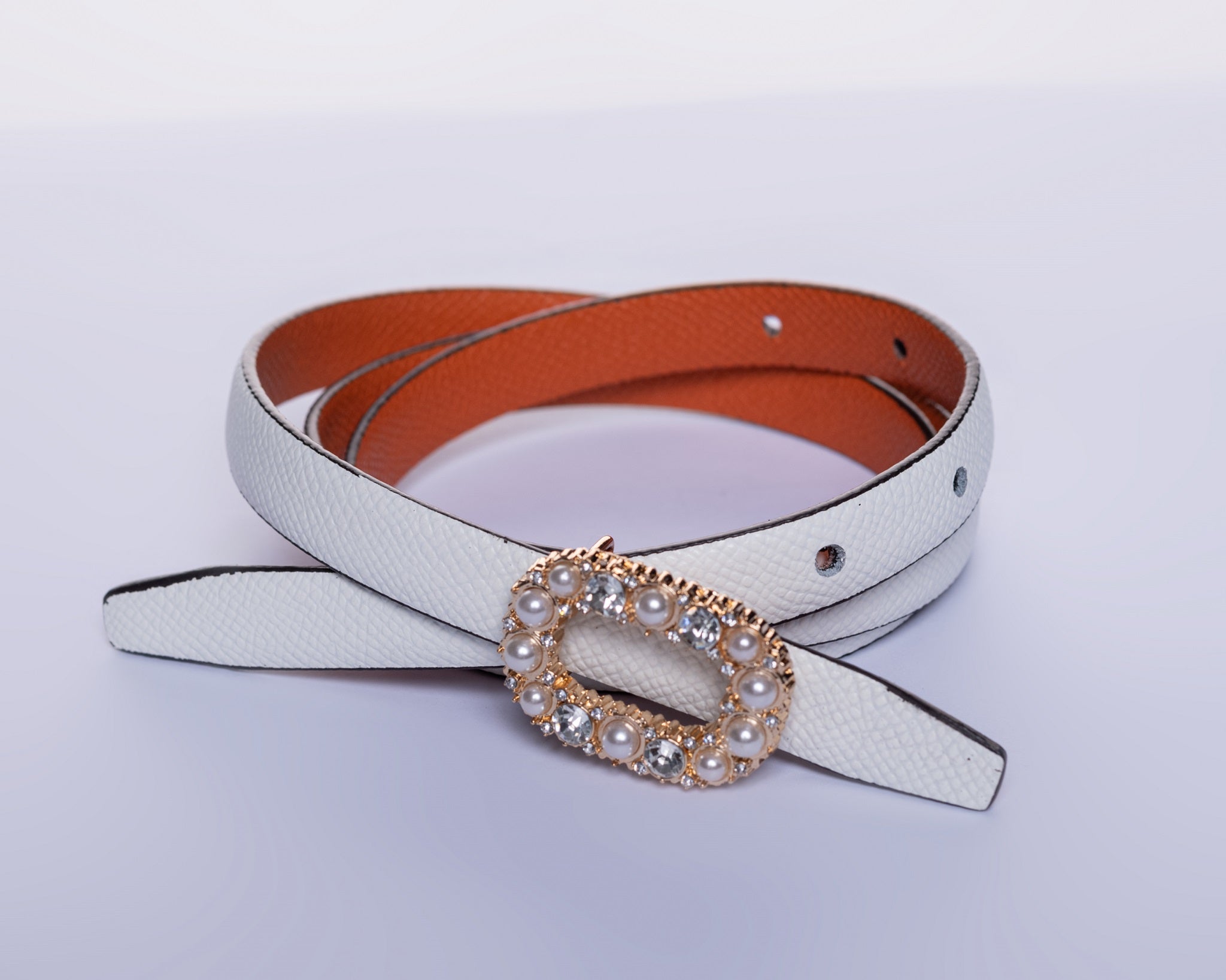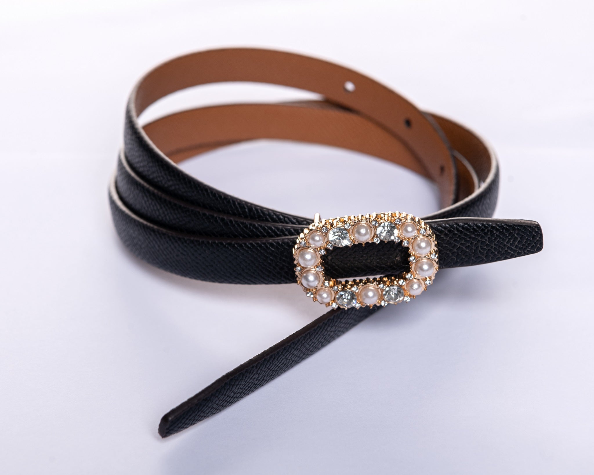 Add a little glitz and glamour to any outfit with this belt, featuring an imitation pearl and rhinestone embellished buckle.