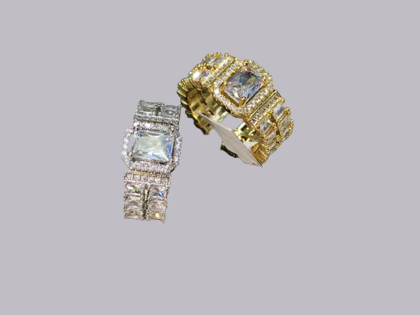 Elegant gold rings with a diamond cluster in a halo setting around round brilliant cut center stones. Unique mix of diamond cuts for an eye-catching look. Perfect for everyday wear or special occasions. Durable and elegant gold highlights the diamonds' beauty.
